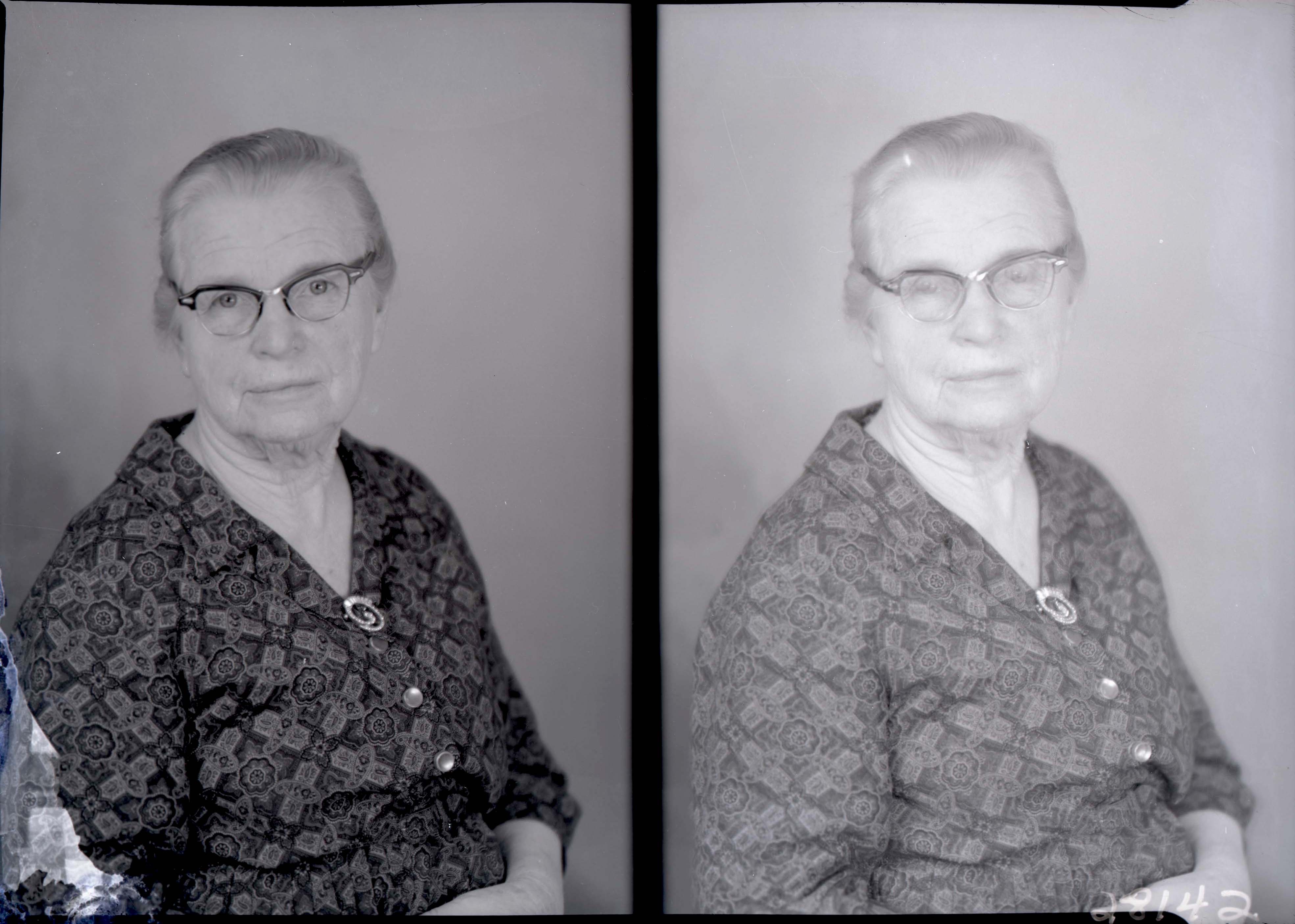 Photo of two separate images of the same unidentified older woman with glasses and wearing a pin with her print dress.