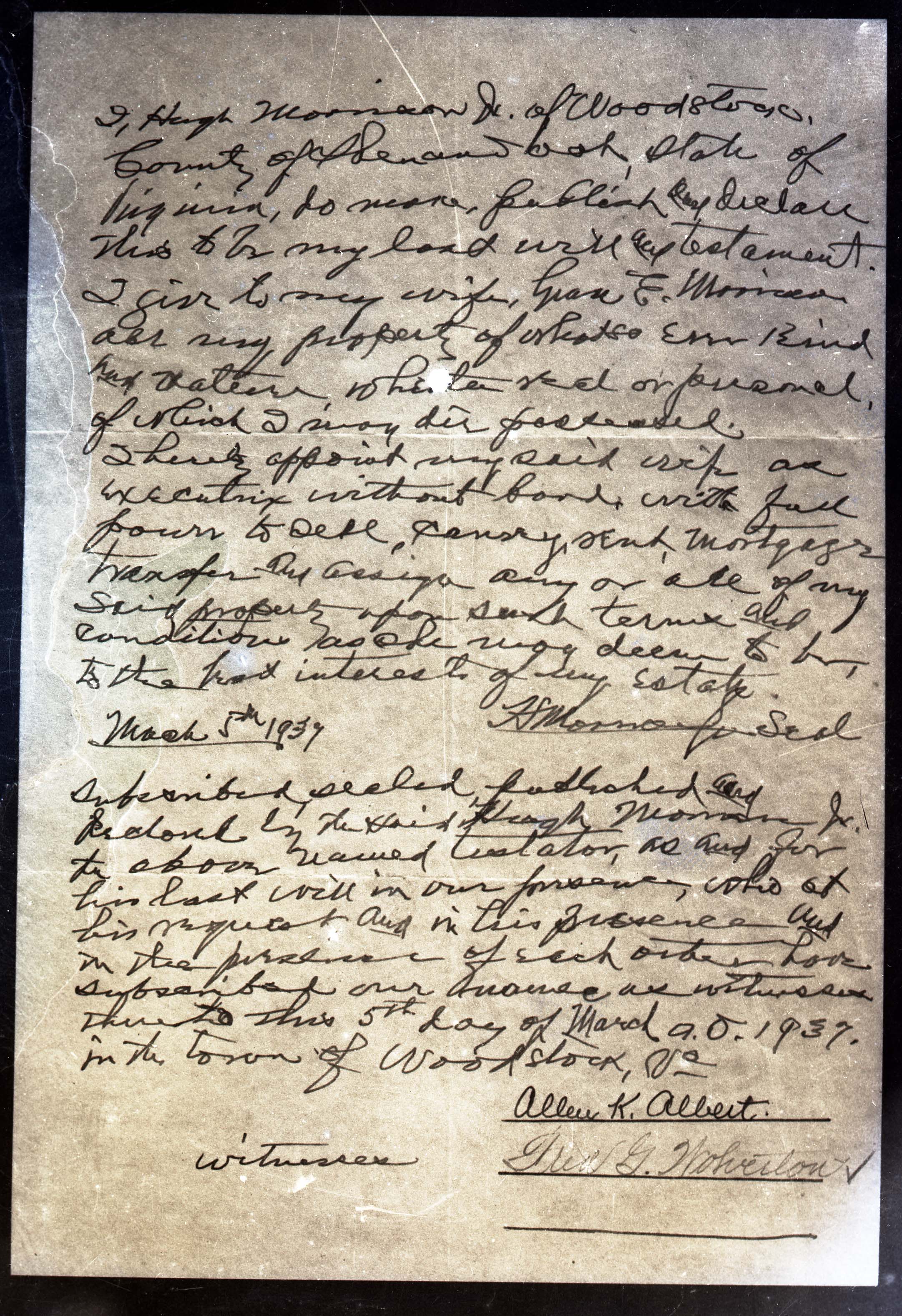 Photograph of the one-page last will and testament of photographer Hugh Morrison, Jr., written in his own hand.