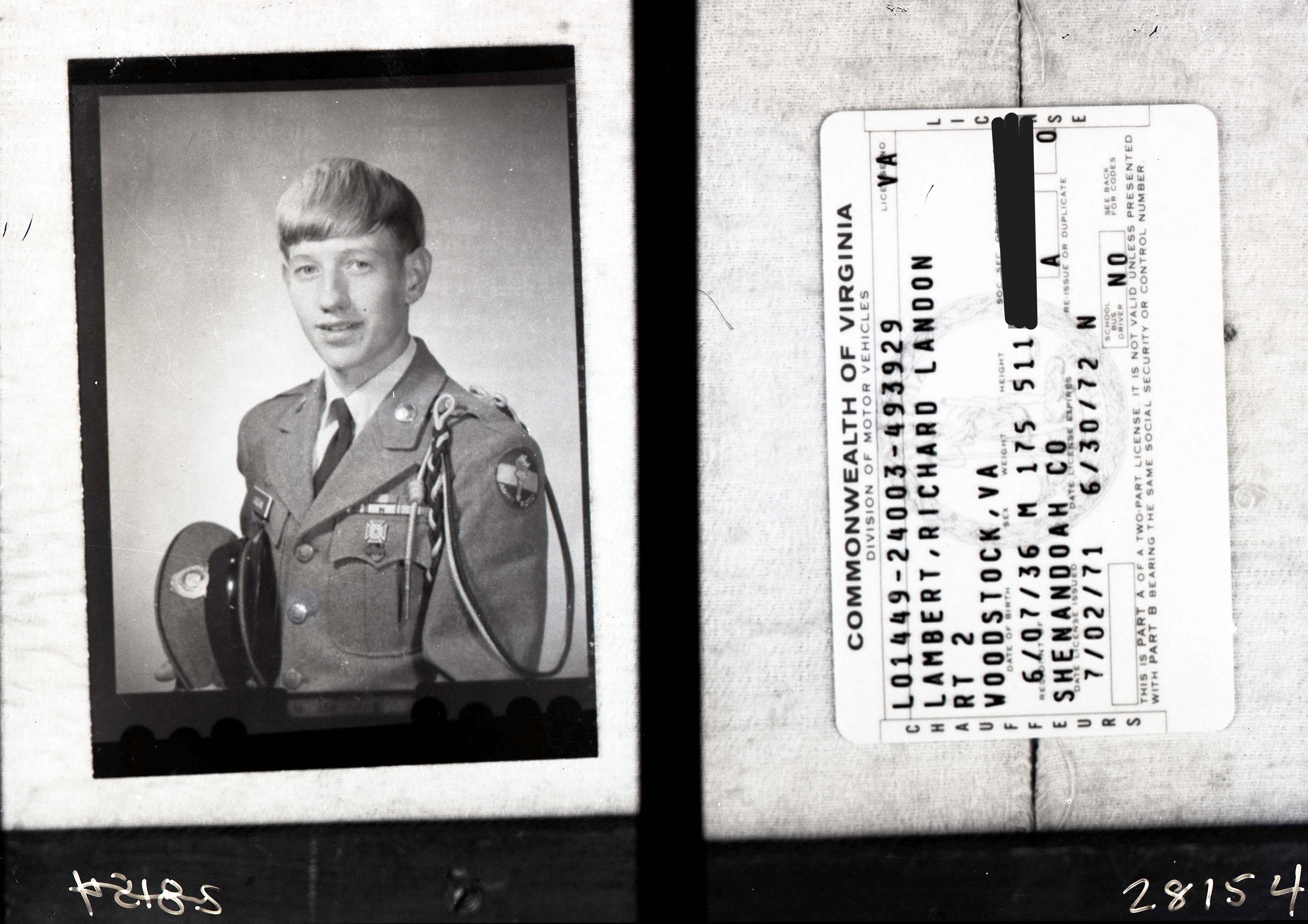 Photograph of an unidentified Massanutten Military Academy (MMA) Cadet wearing a JROTC Uniform (left) and a photograph of Richard Lambert's Driver's License (right).