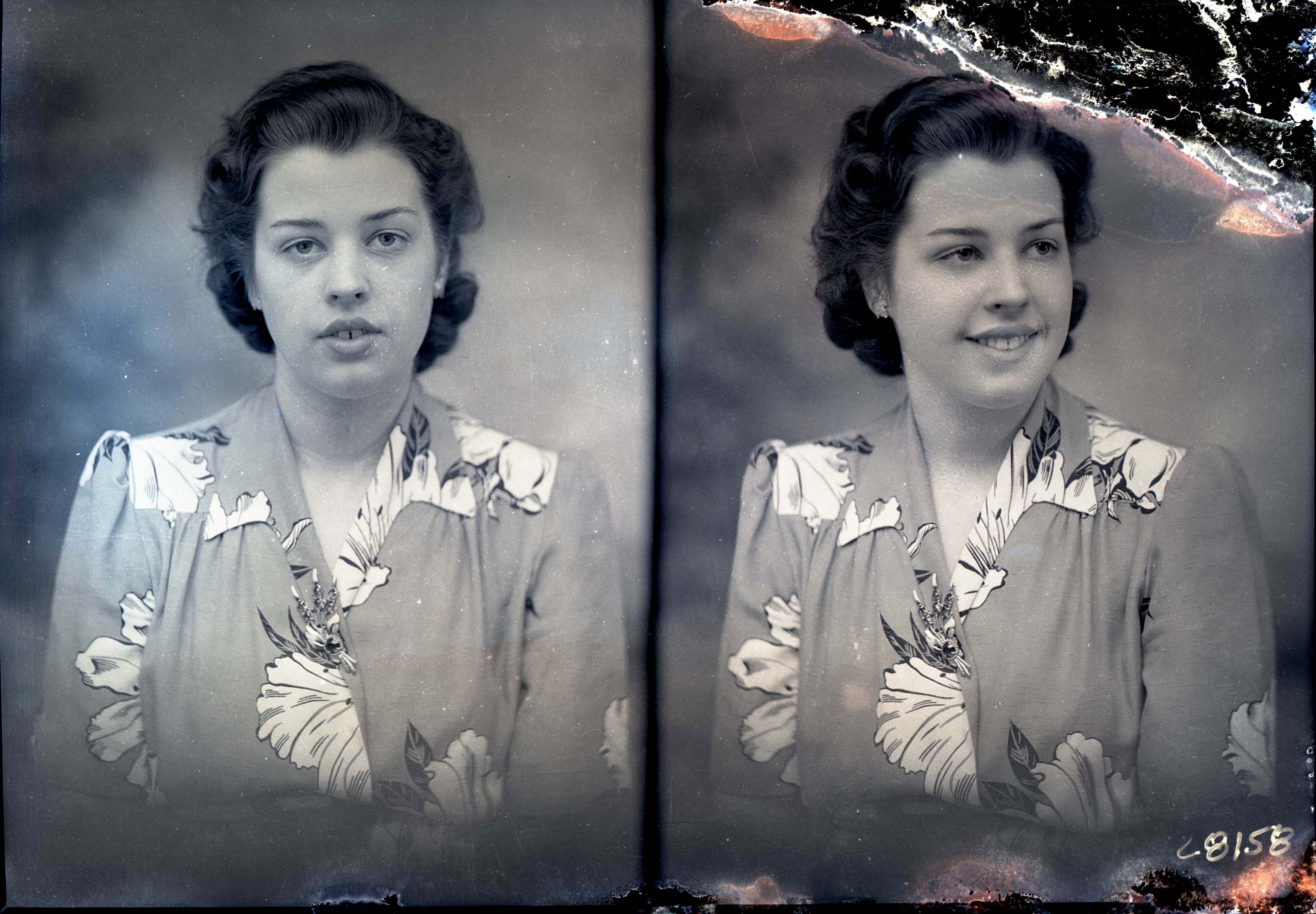 Photo of two separate portrait photographs of Gladys (Hammond) Funkhouser as a young woman in a flowered dress.