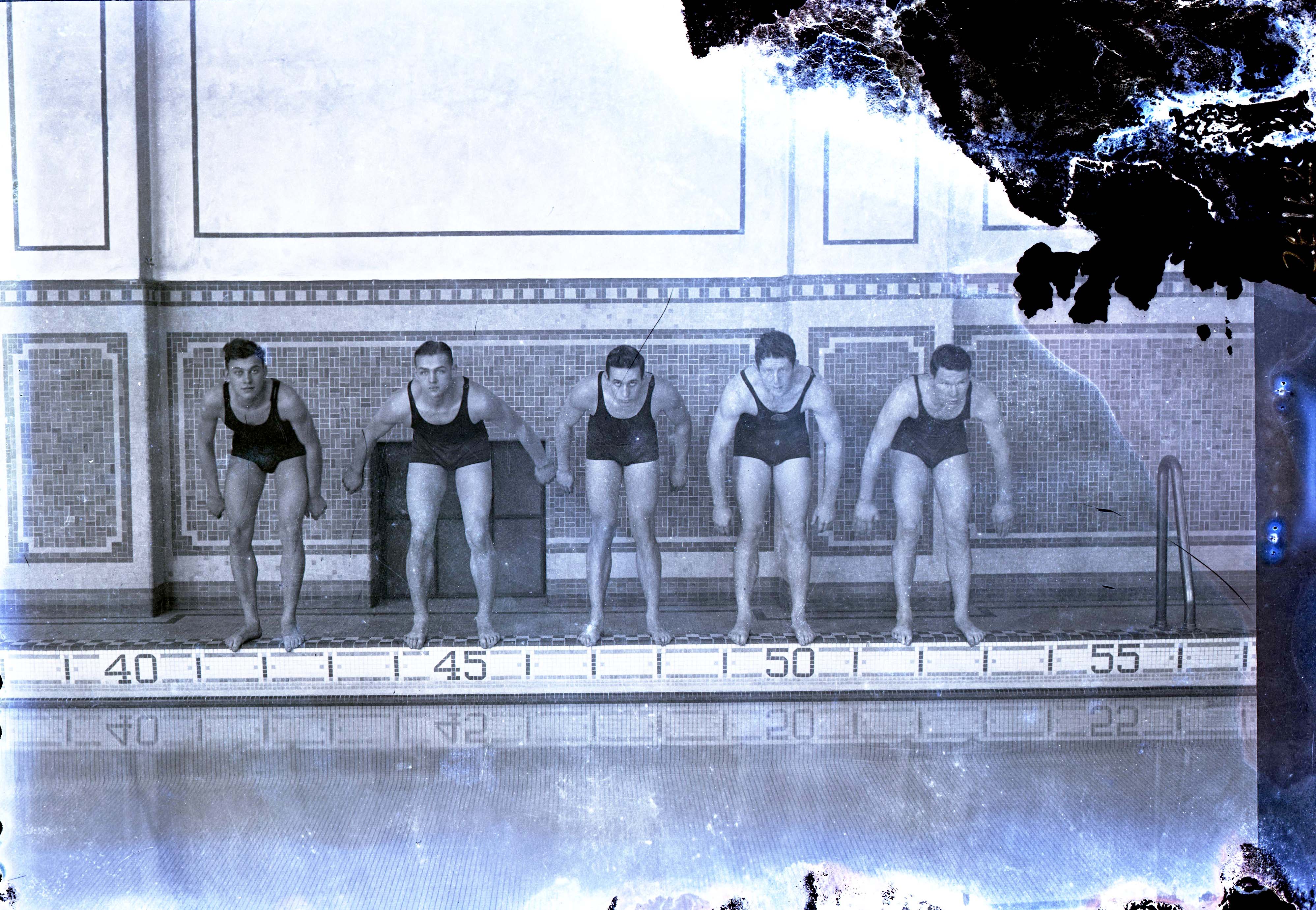 Photograph of five unidentified cadets from Massanutten Military Academy in swimming suits and shown by the side of the pool about to dive in.