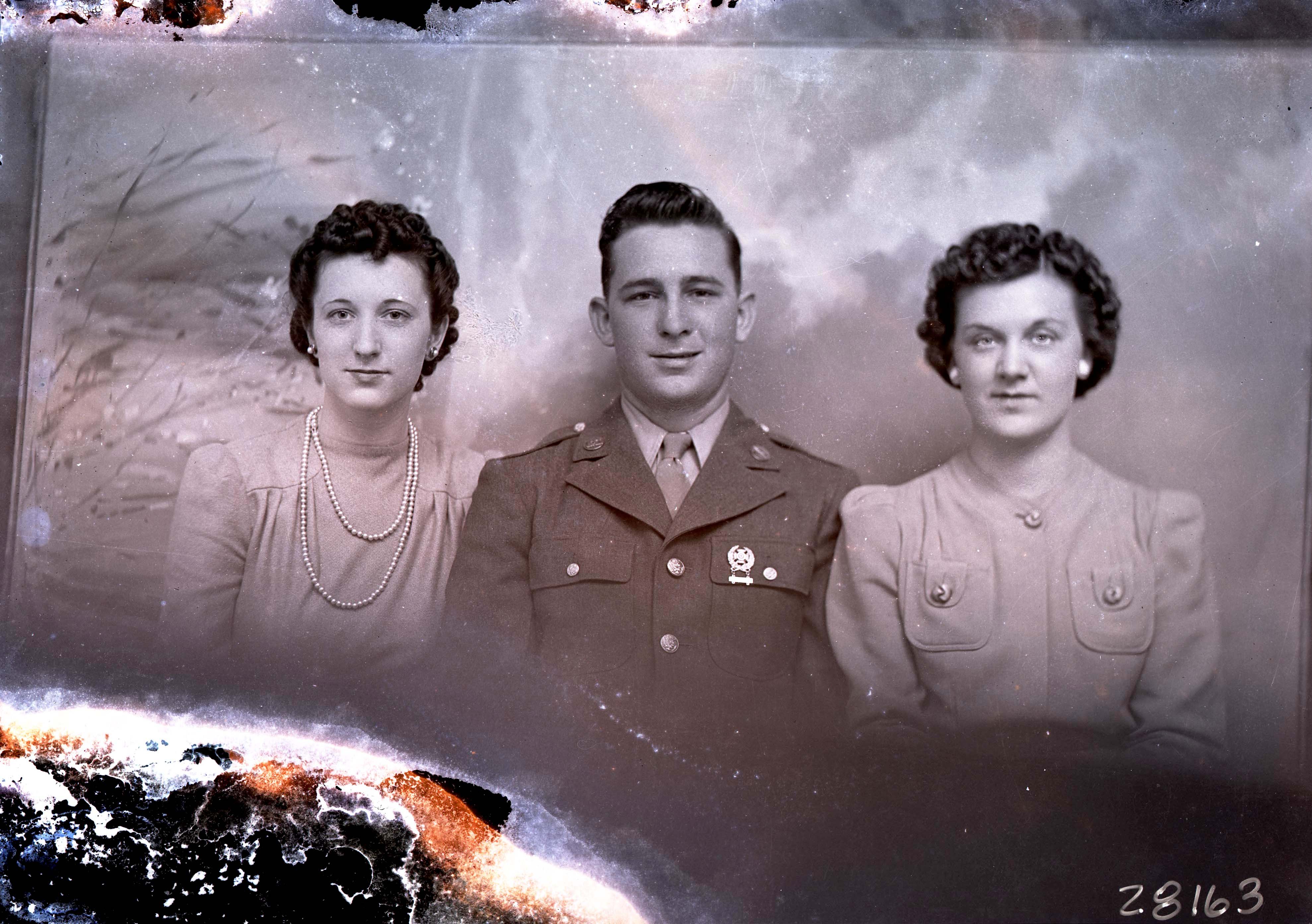 Photo of a portrait photograph of an unidentified young man in a U.S. Army uniform flanked by two unidentified women, possibly his sisters.