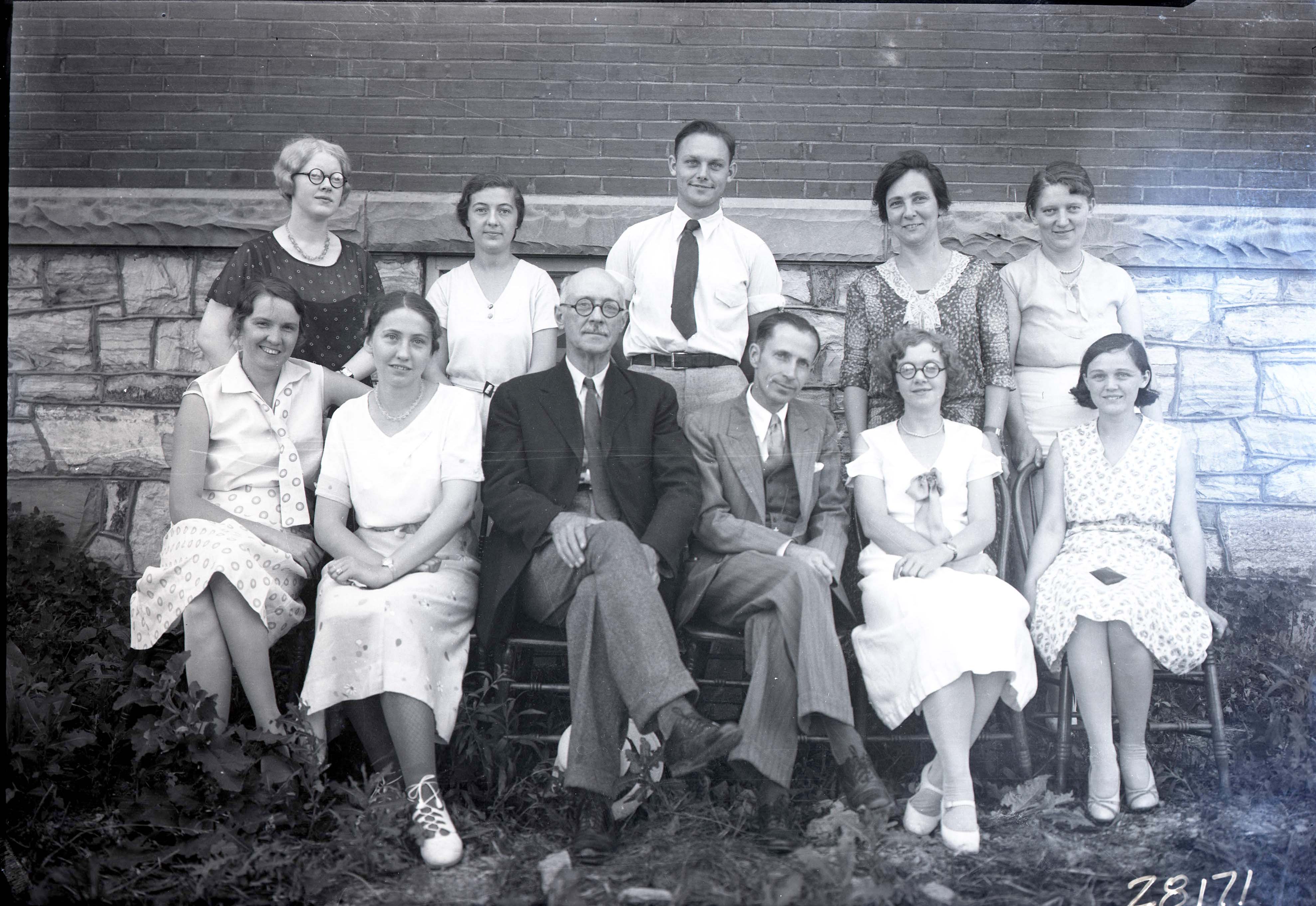 Group of unidentified three men and eight women posed in two rows in front of a brick and stone building.