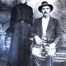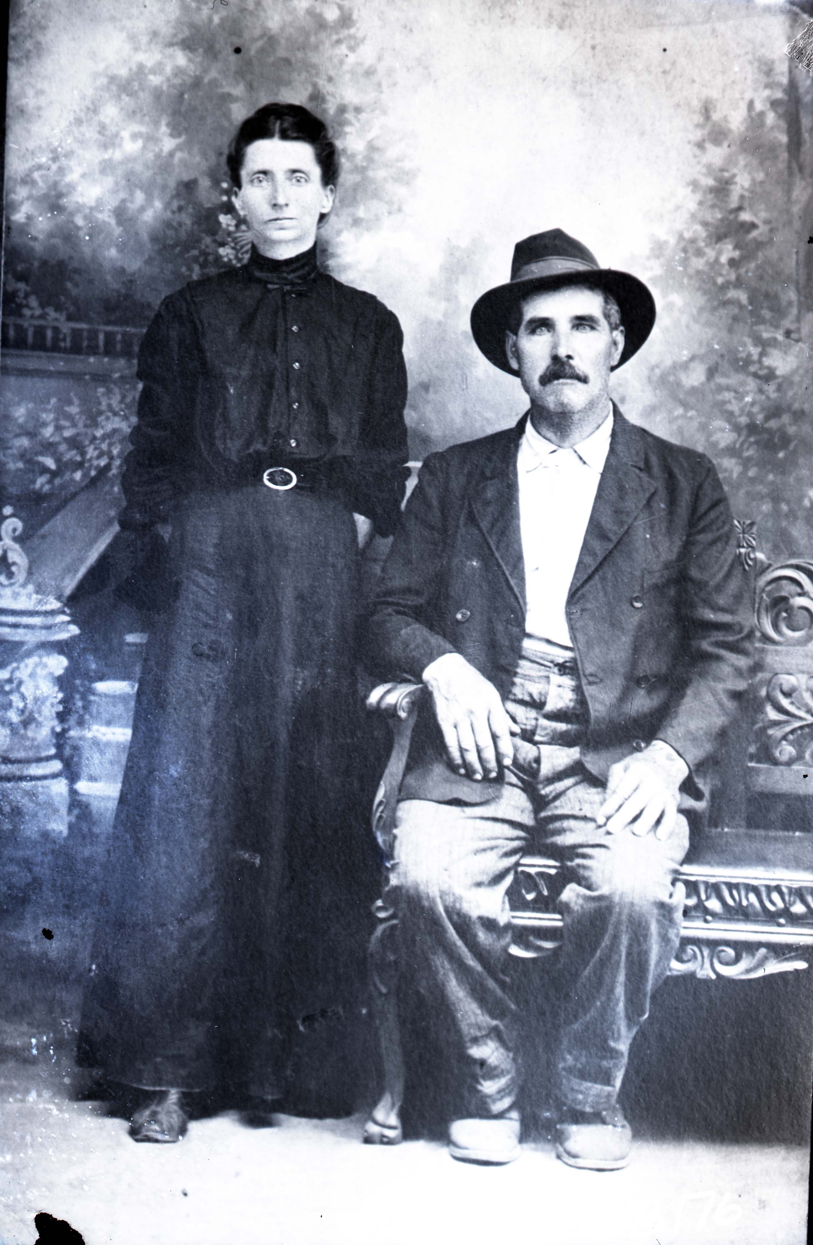 Unidentified woman wearing a long dress is standing beside an unidentified man with a mustache, seated, and wearing a hat.