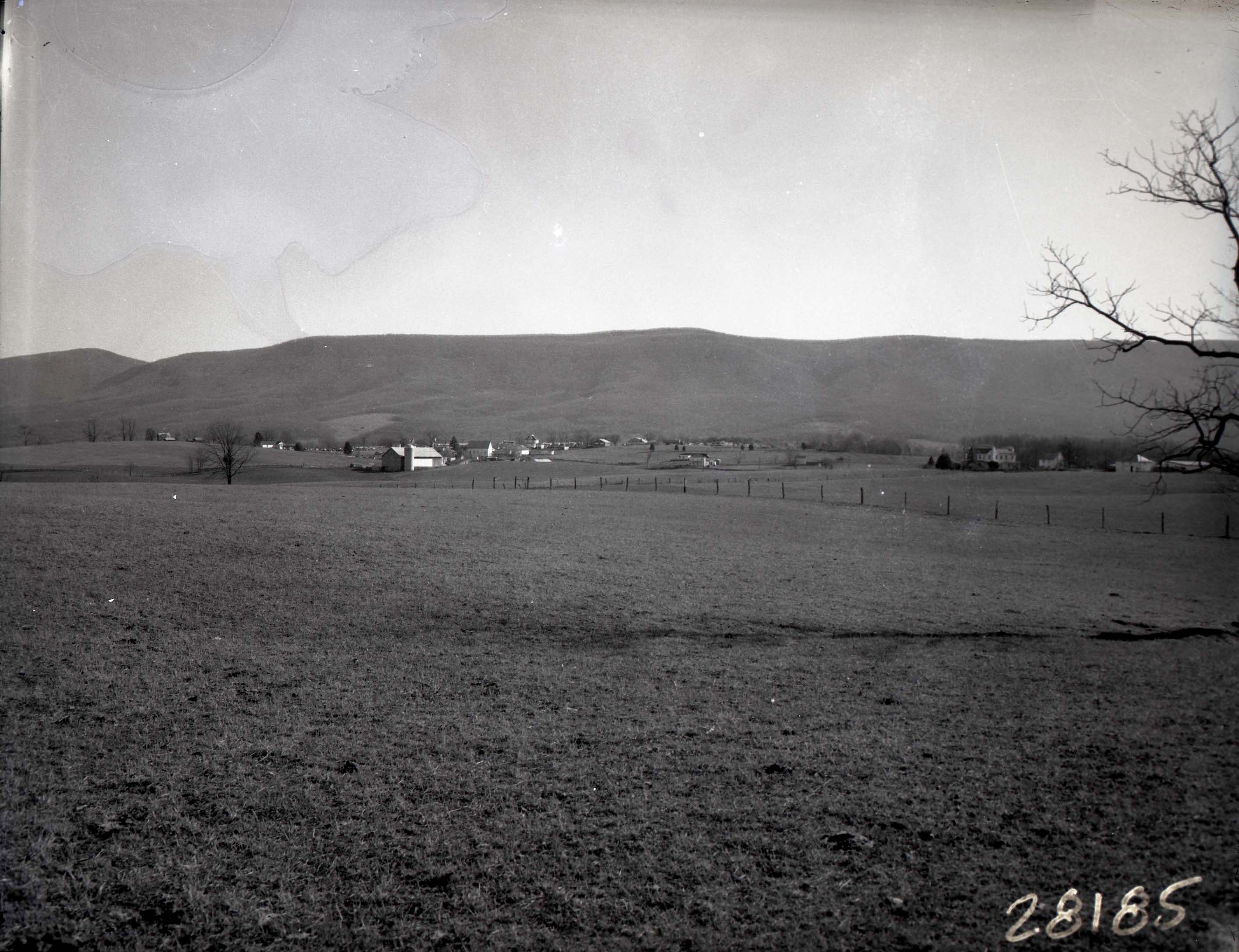 View looking across the Shenandoah Valley towards mountains. Farms and outbuildings are visible in the distance.