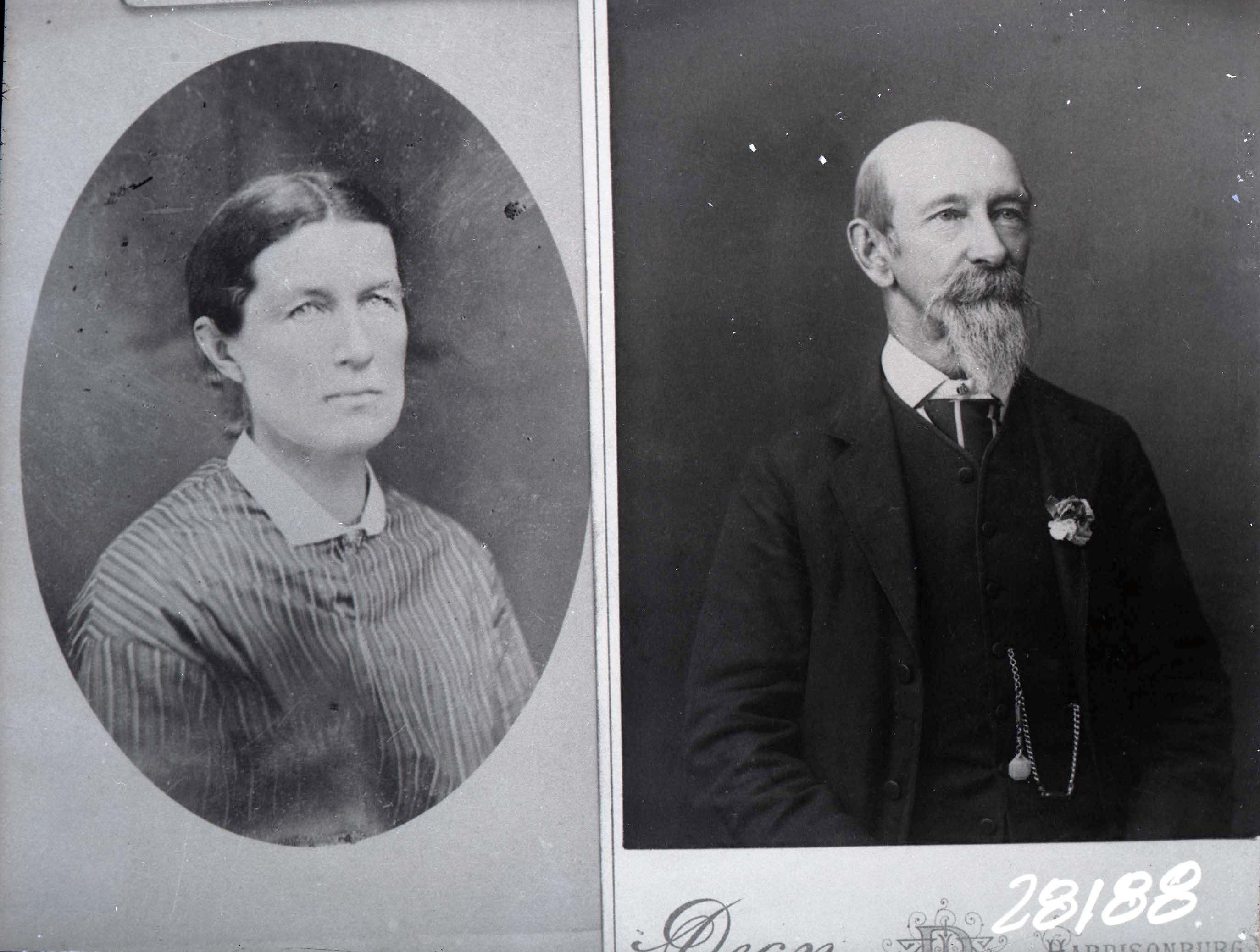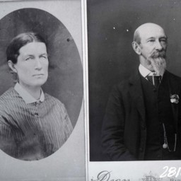 Photo of two separate portrait photographs of different, unidentified people, a woman and a bearded man with a mustache.
