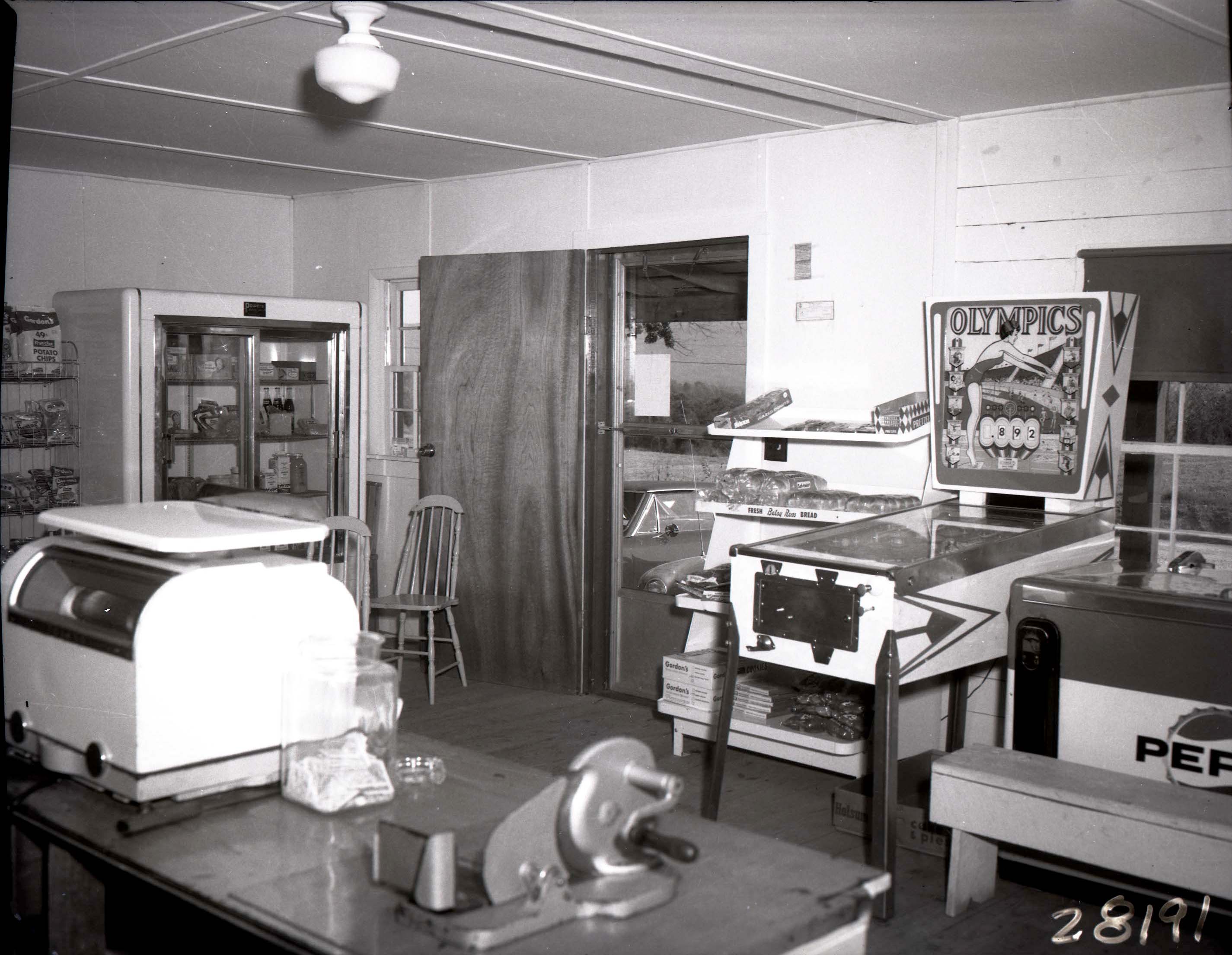 There is a meat/produce scale on the left and a pinball machine and Pepsi cooler on the right.