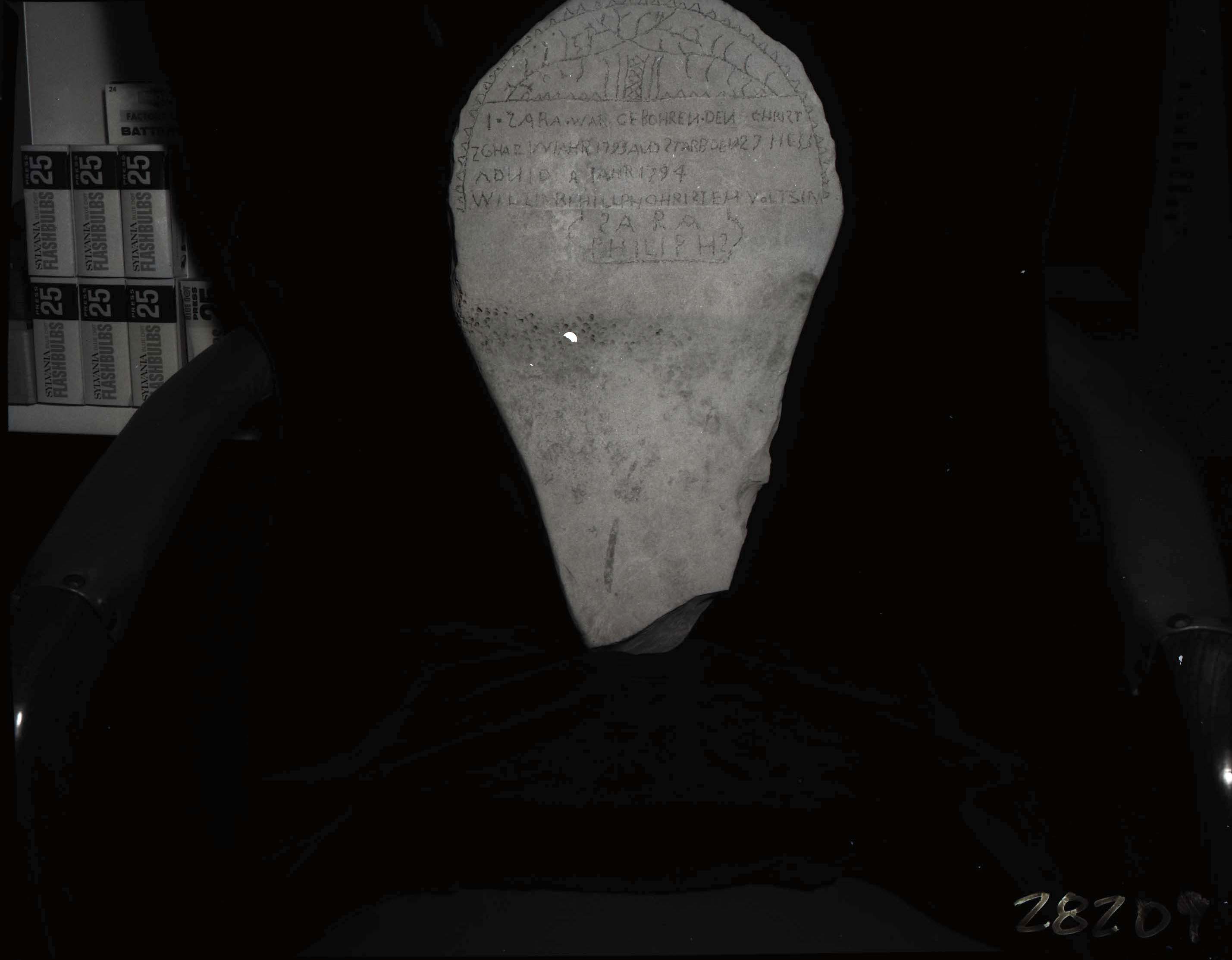 Photograph of an engraved stone marker taken in the studio against a black background drape.