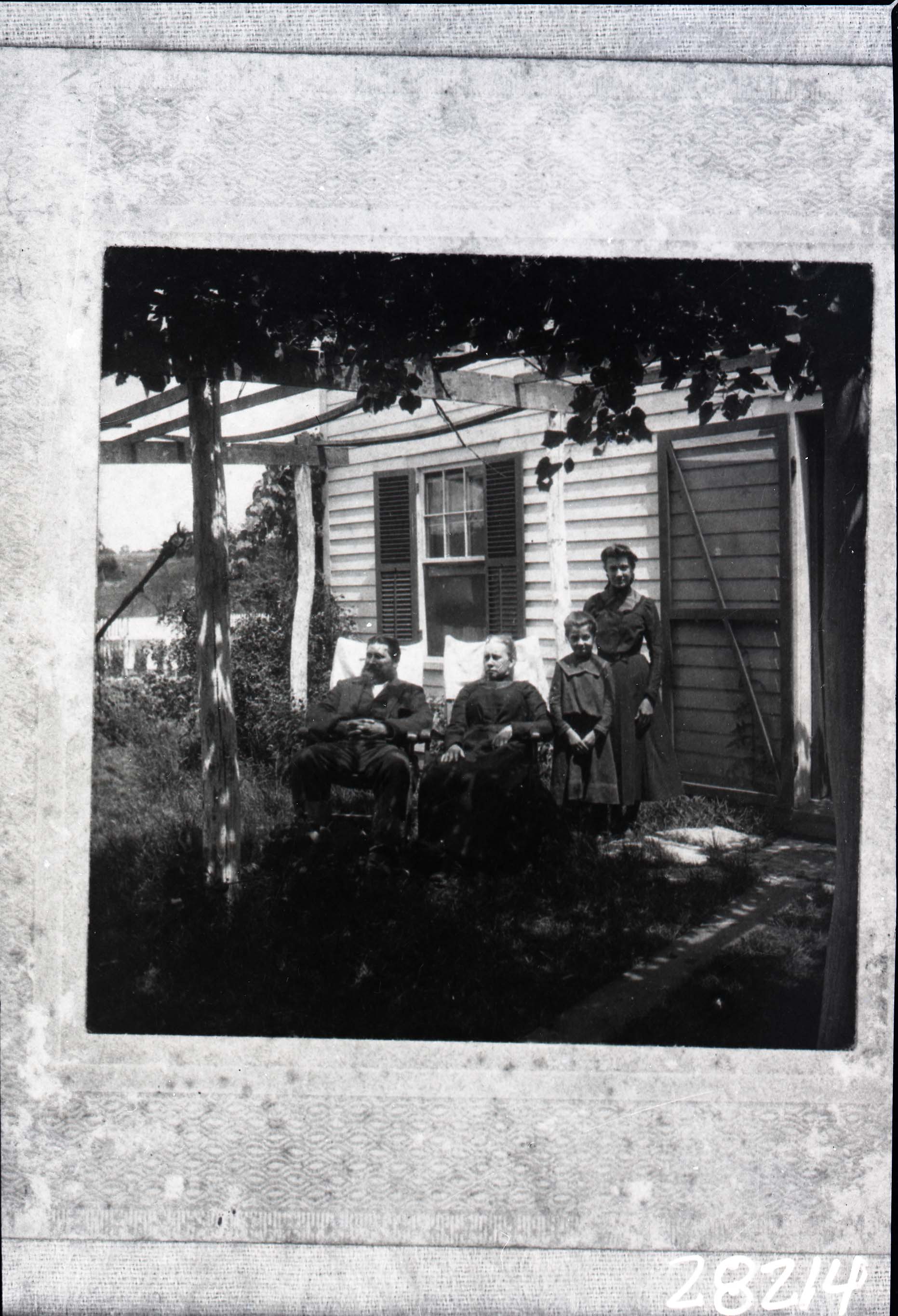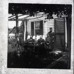 Photo of a framed photograph of four unidentified people posed outside of a house.