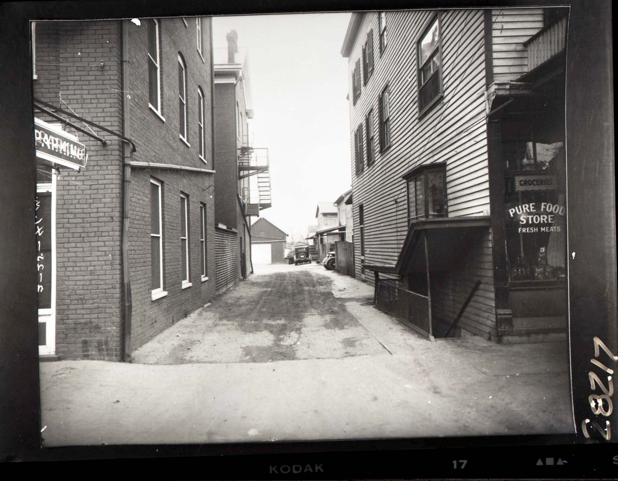 View down the alley between the Woodstock Hotel and the Pure Food Store. A vintage automobile is visible at the end of the alley.