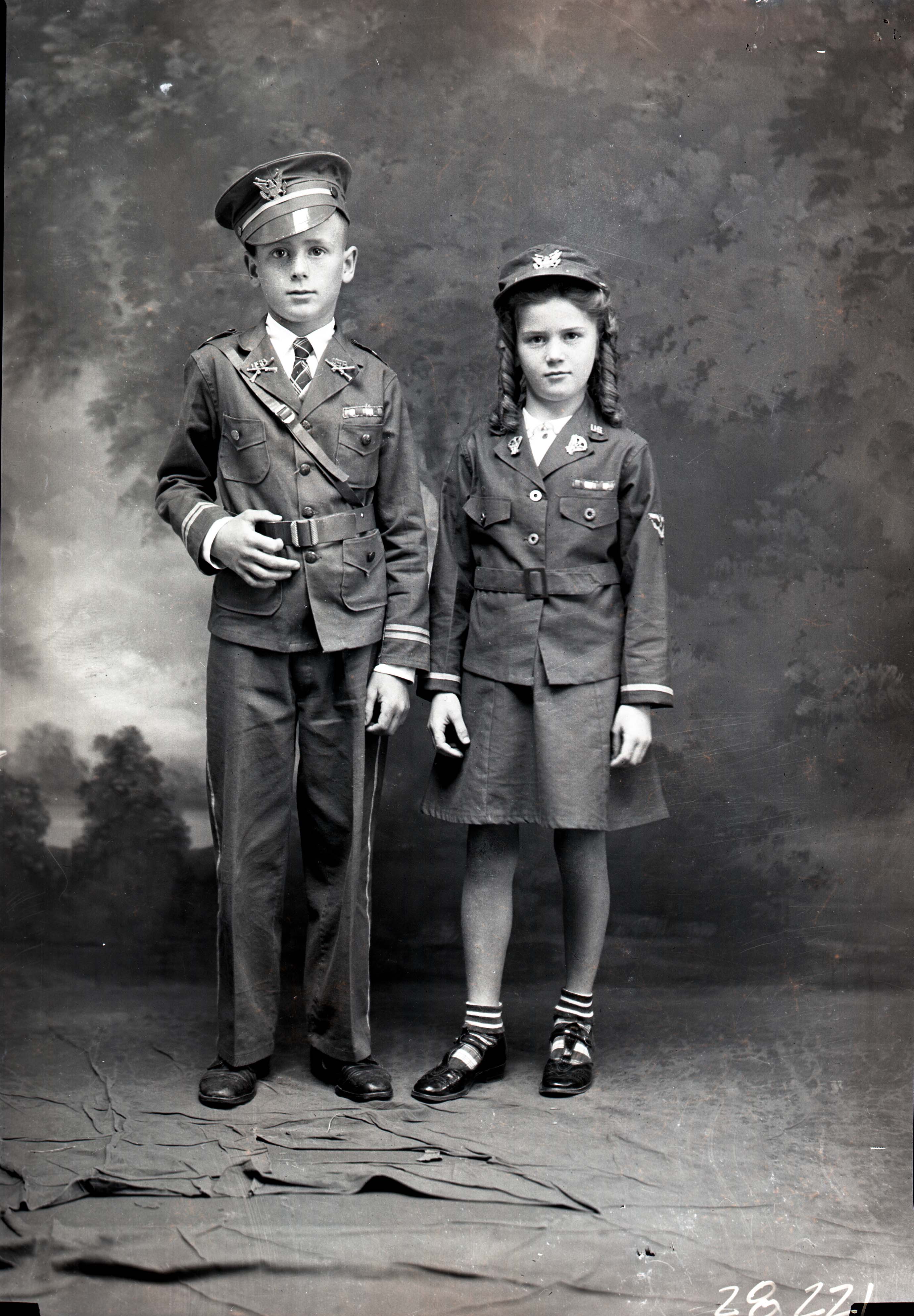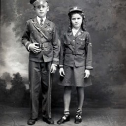 Unidentified boy and girl, both wearing a military-styled costumes, are standing beside each other.