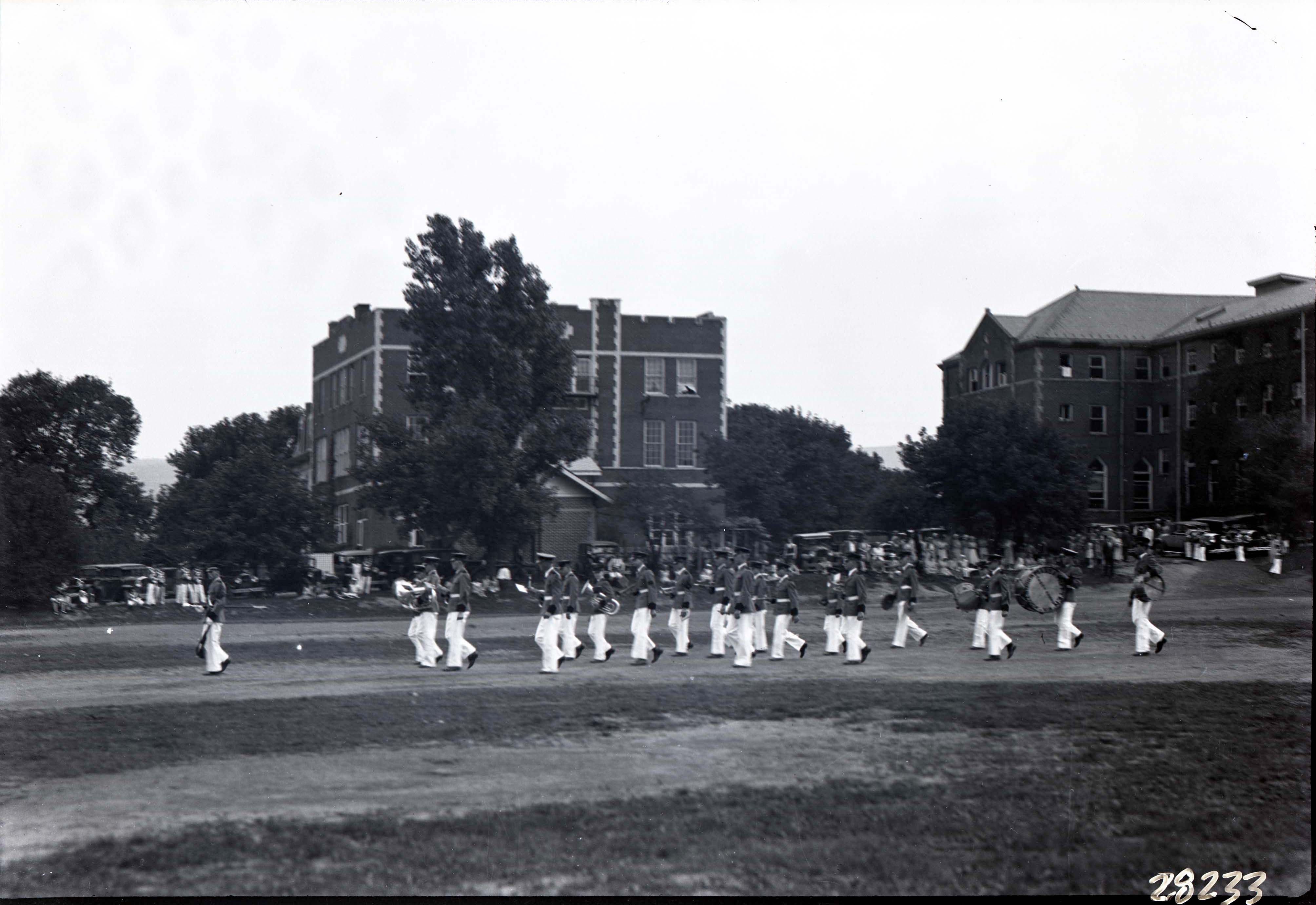 Unidentified cadets from Massanutten Military Academy (MMA) are on parade on a field on campus.
