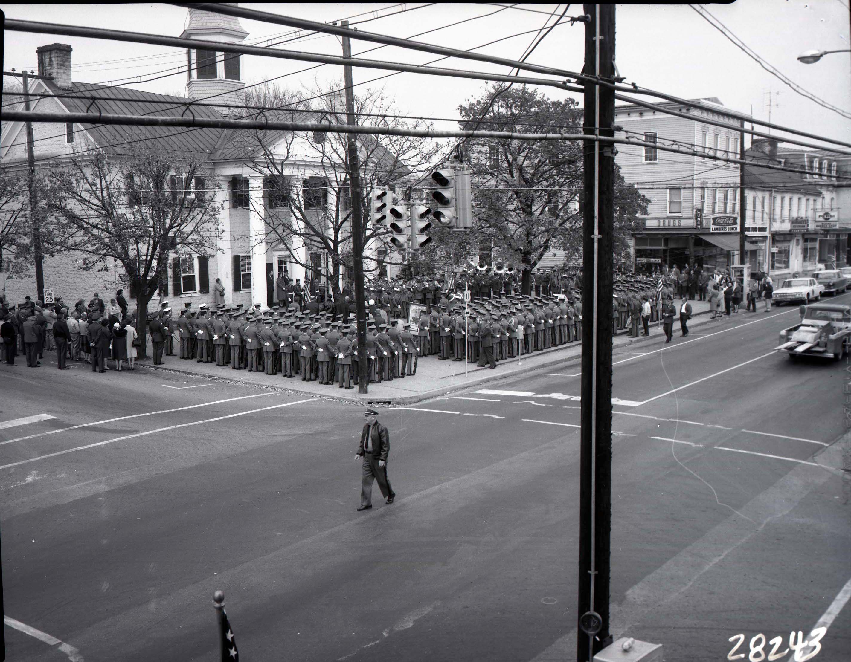 Large group of cadets from Massanutten Military Academy (MMA) are gathered in front of the historic courthouse in Woodstock as part of the town's annual Veteran's Day festivities.