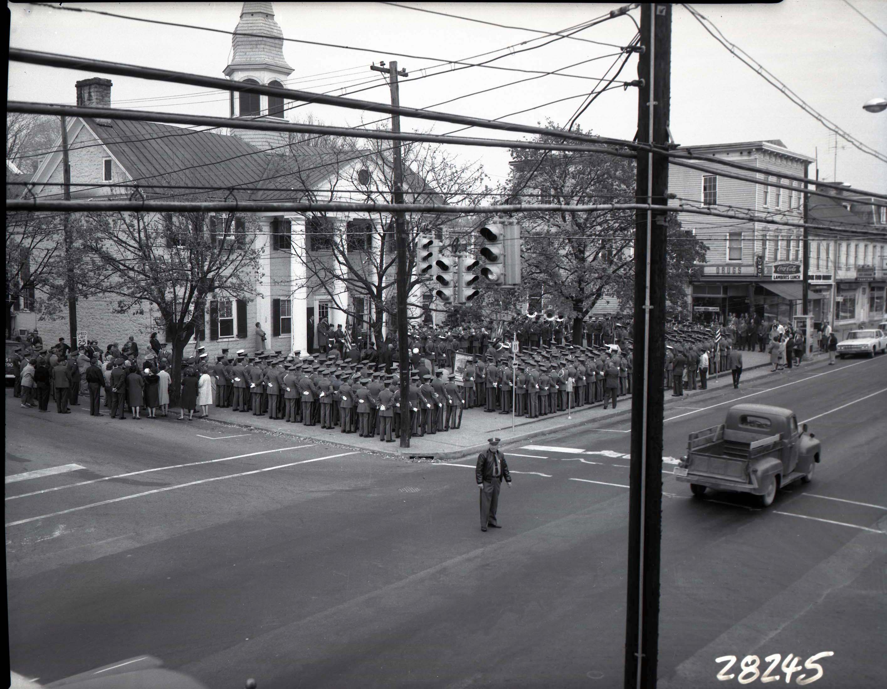 Large group of unidentified cadets from Massanutten Military Academy (MMA) are gathered in front of the historic courthouse in Woodstock as part of the town's annual Veteran's Day festivities.