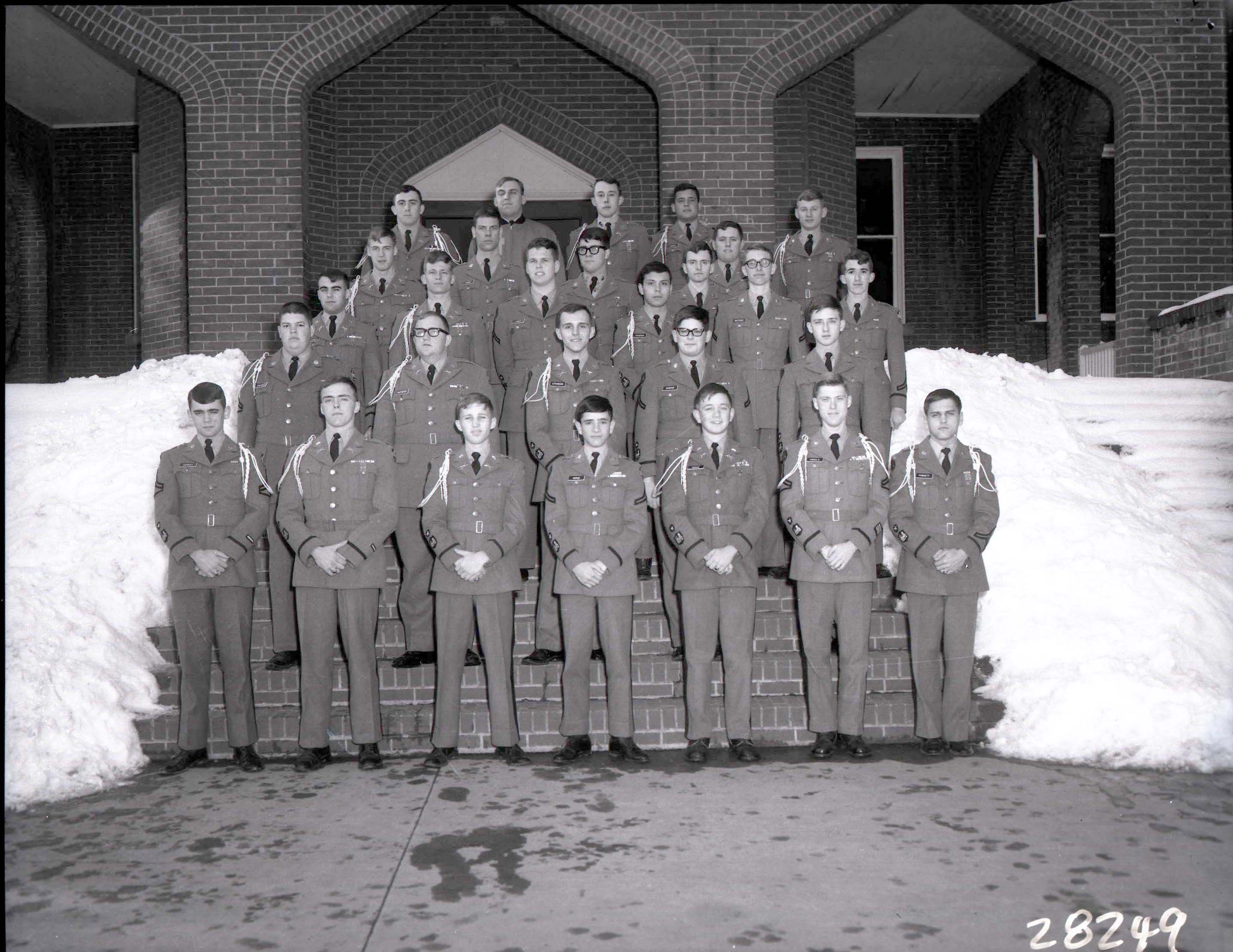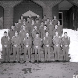 Group of unidentified cadets from Massanutten Military Academy (MMA) are posed on the steps of Lantz Hall.