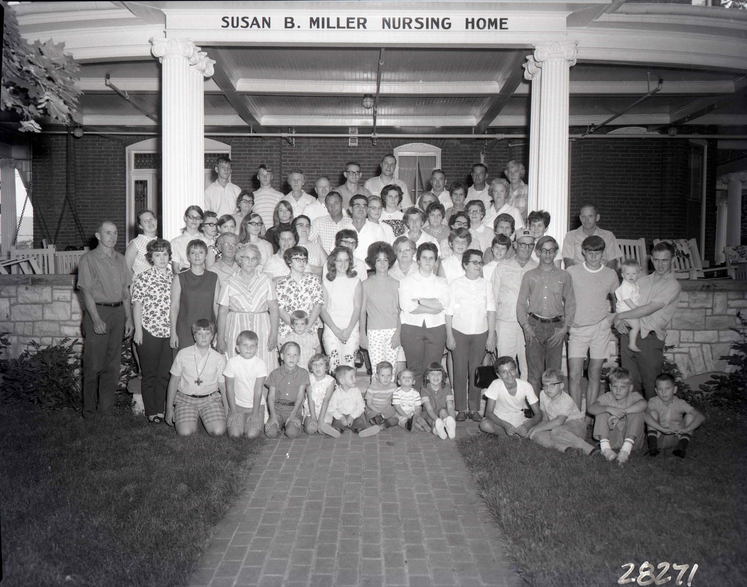 Large group of unidentified men, women, and children posed on the steps of the "Susan B. Miller Nursing Home" on N. Muhlenberg Street in Woodstock Virginia.