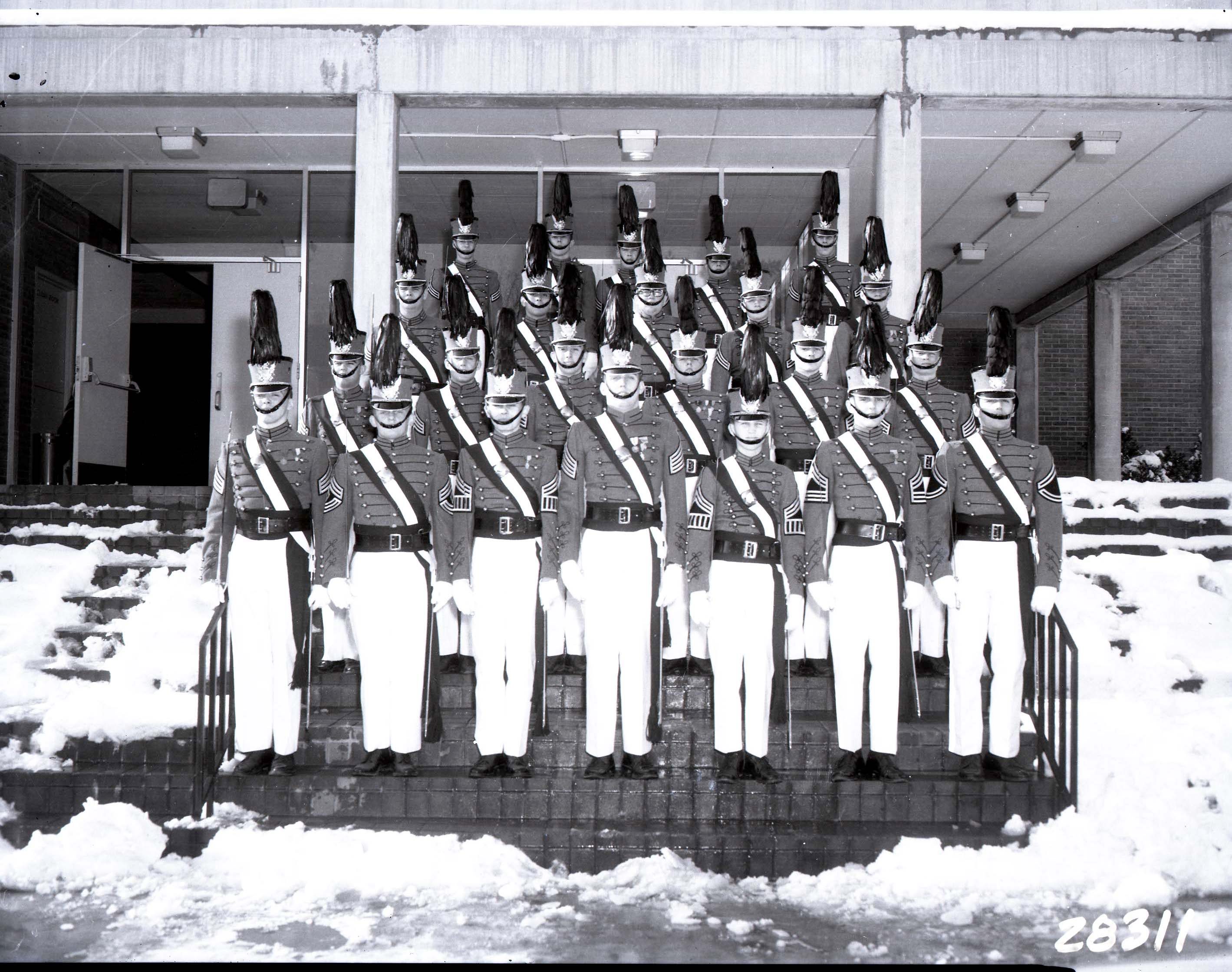 Group of unidentified cadets from Massanutten Military Academy (MMA) posed on the steps of the school's gymnasium and wearing dress uniforms.