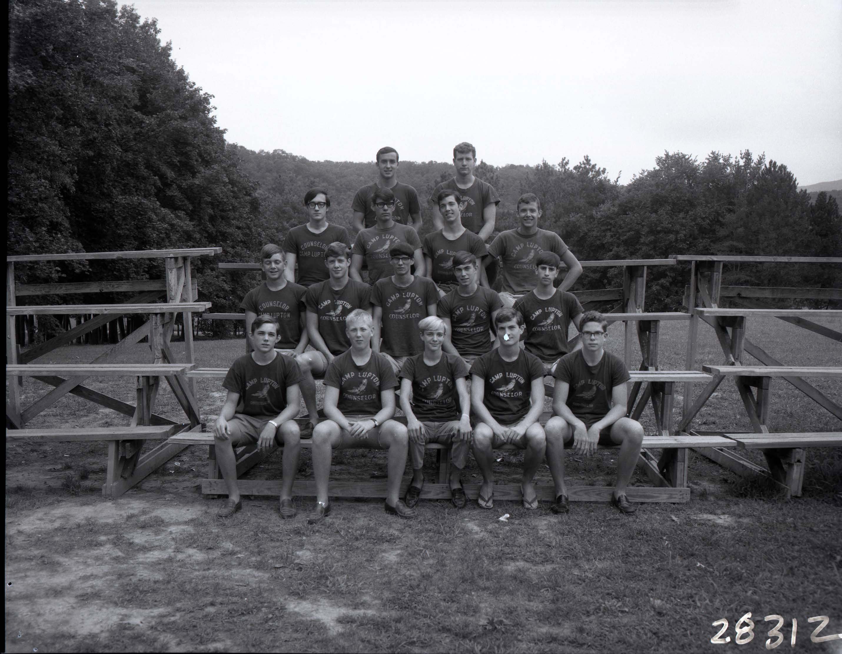 Group of unidentified young men, mostly teen-aged, posed together on bleachers at Camp Lupton. All are wearing the same t-shirt that says, "Camp Lupton - Counselor" on the front.