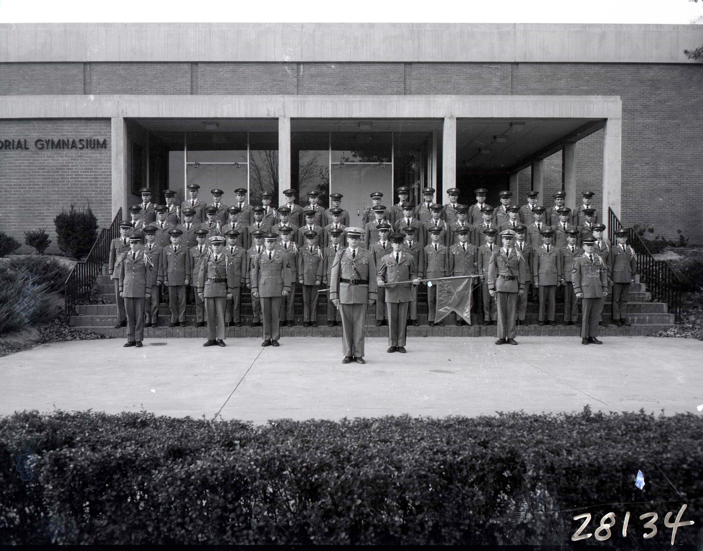 Group of unidentified cadets from Massanutten Military Academy (MMA) posed in rows on the steps of their school's gymnasium.