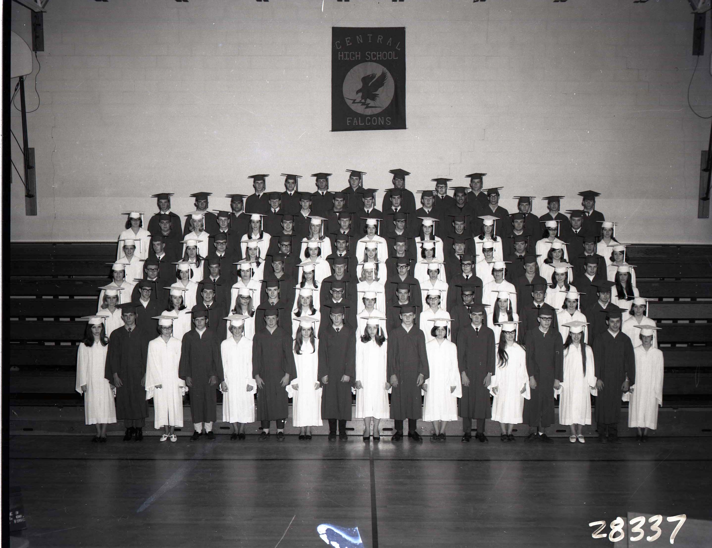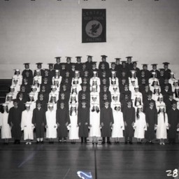 Photograph of a graduating class of unidentified seniors at Central High School in Woodstock, posed on the bleachers of their gymnasium in their caps and gowns.
