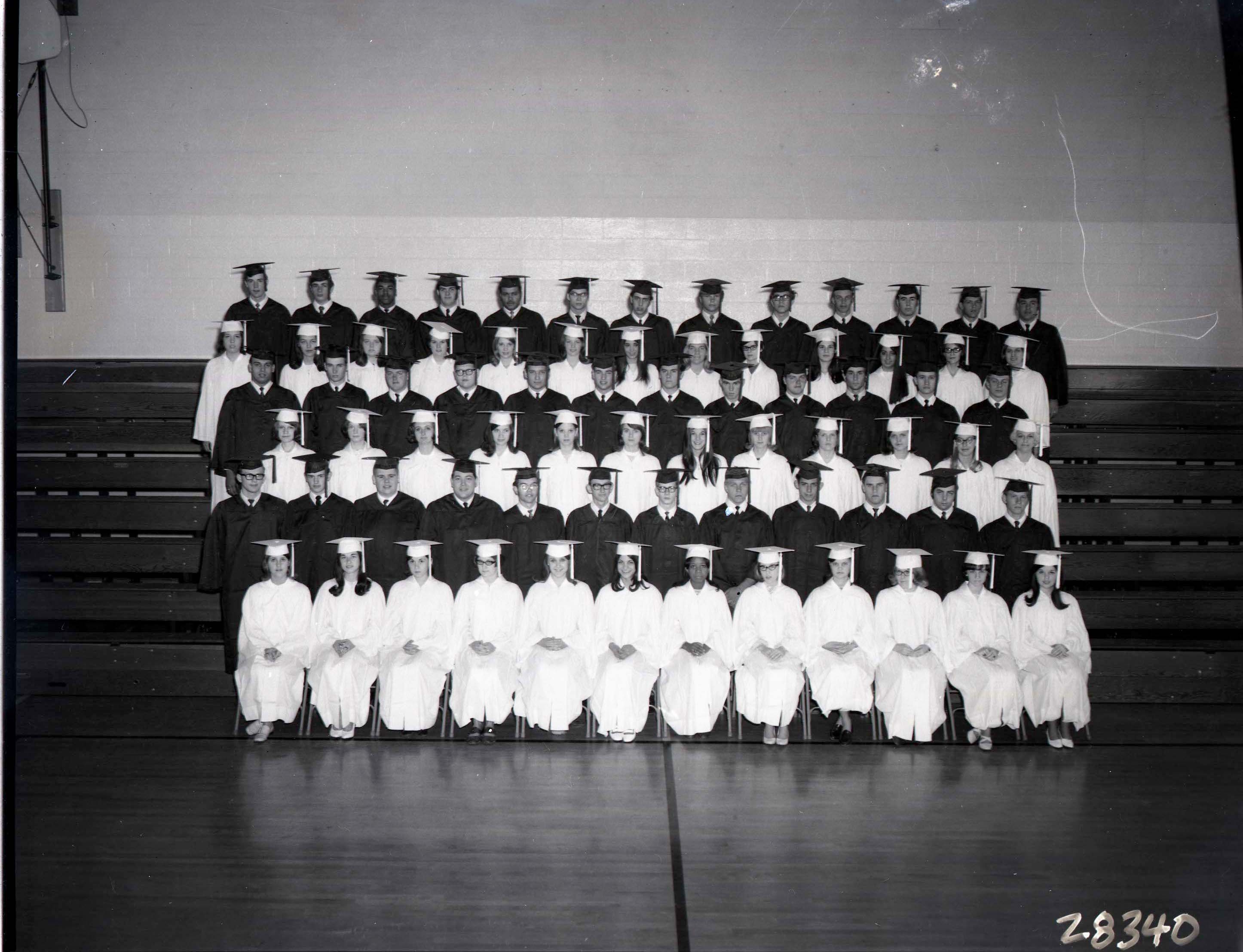 Photograph of a graduating class of unidentified seniors at Central High School in Woodstock, posed on the bleachers of their gymnasium in their caps and gowns.