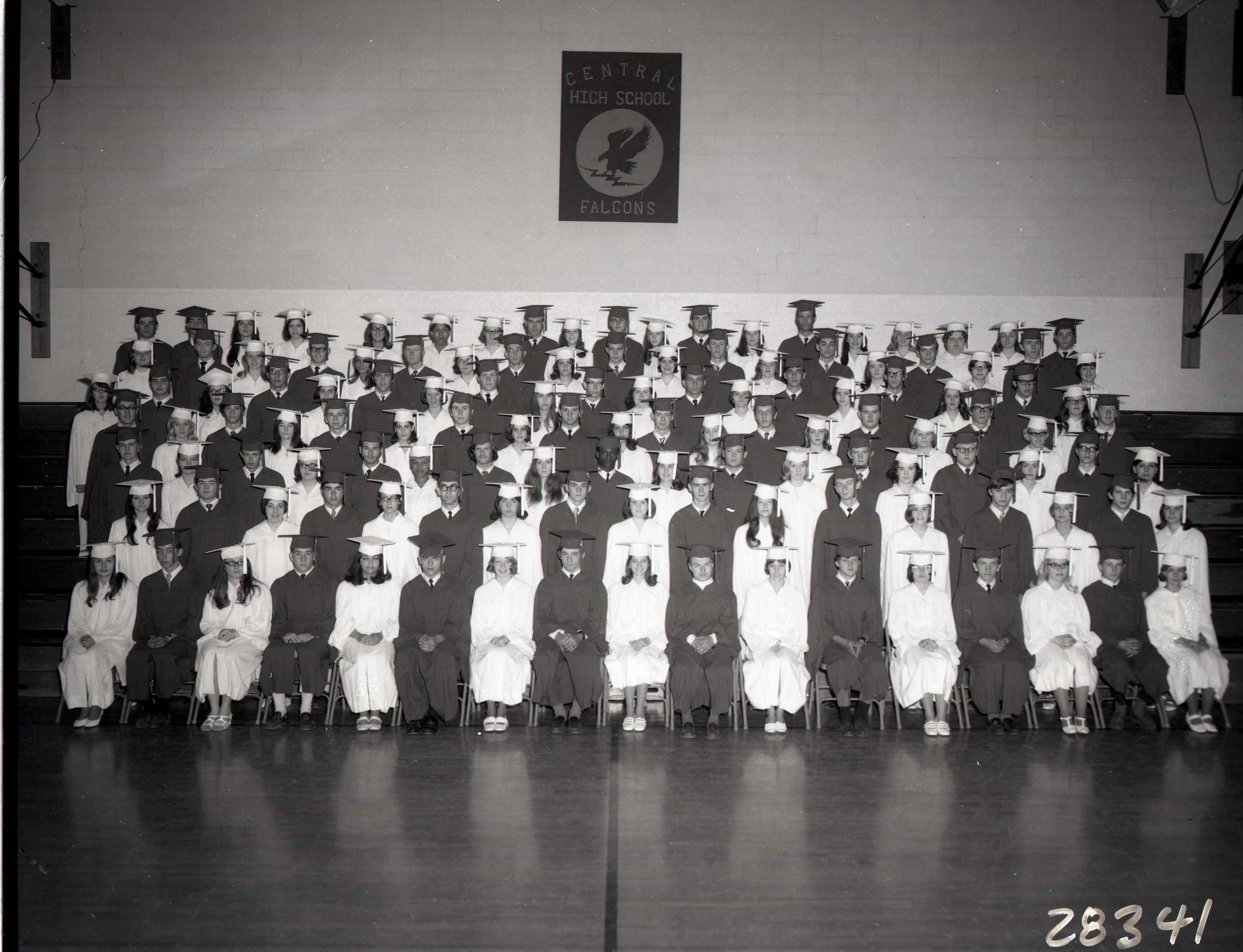 Photograph of a graduating class of unidentified seniors at Central High School in Woodstock, posed on the bleachers of their gymnasium in their caps and gowns.