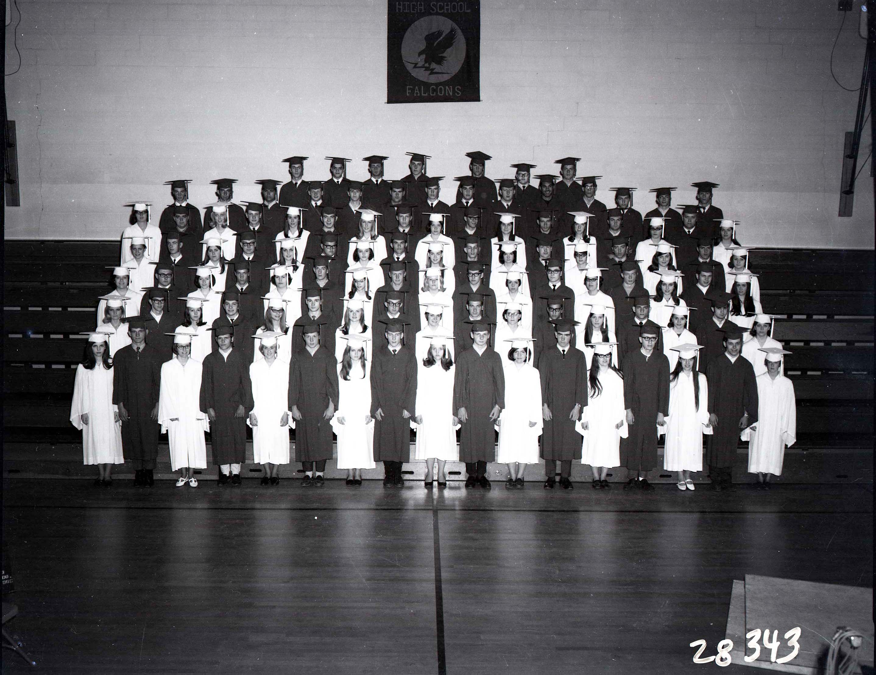 Photograph of a graduating class of unidentified seniors at Central High School in Woodstock, posed on the bleachers of their gymnasium in their caps and gowns.