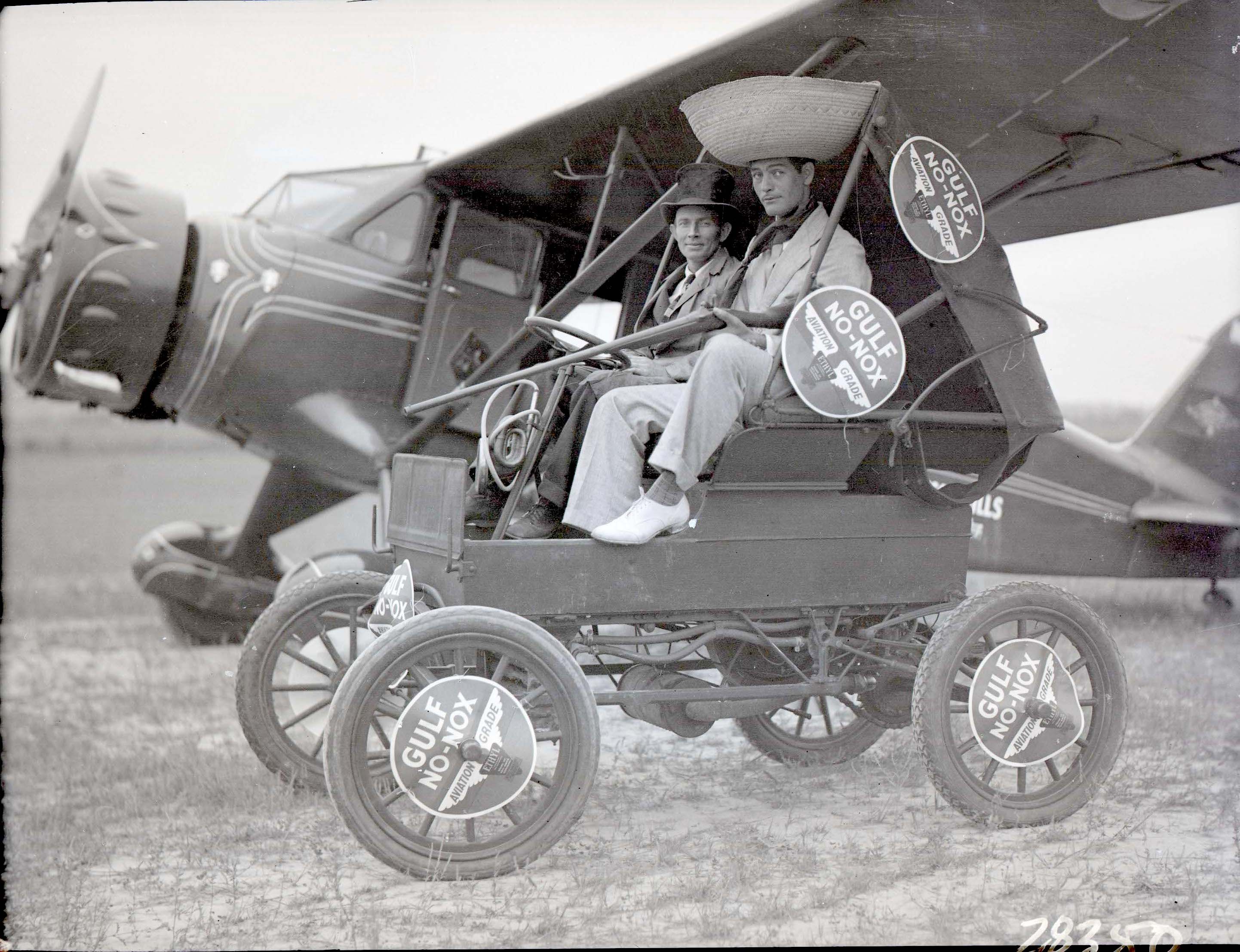 Two unidentified men in costumes are posed with an early automobile decorated with Gulf Oil Company signs and a small airplane behind them.