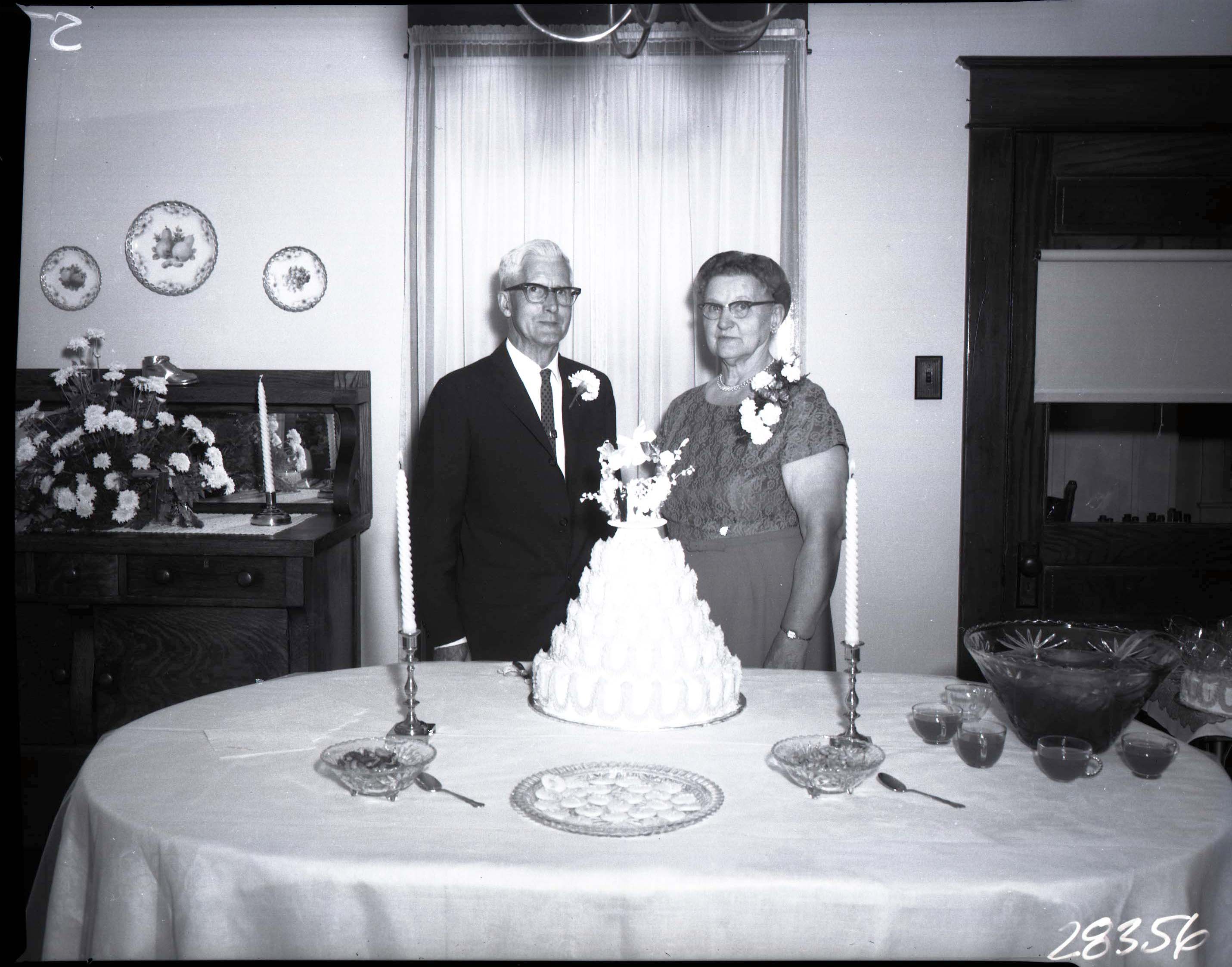 Photograph of Luther B. Kohne and his wife, Mamie B. (Sager) Kohne, posed behind a large multi-tiered cake.
