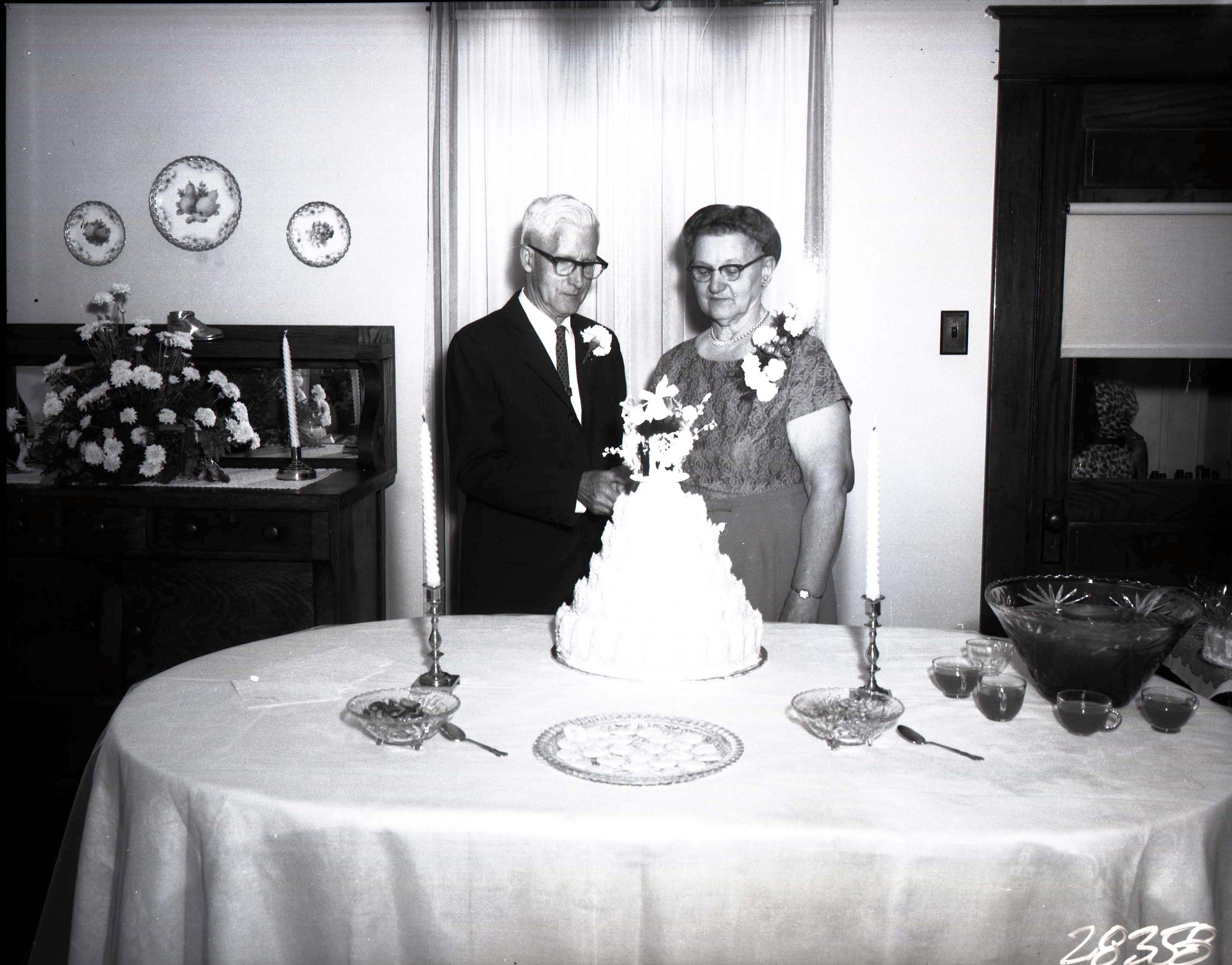 Photograph of Luther Branson Kohne and his wife, Mamie B. (Sager) Kohne standing together behind a multi-tiered cake.