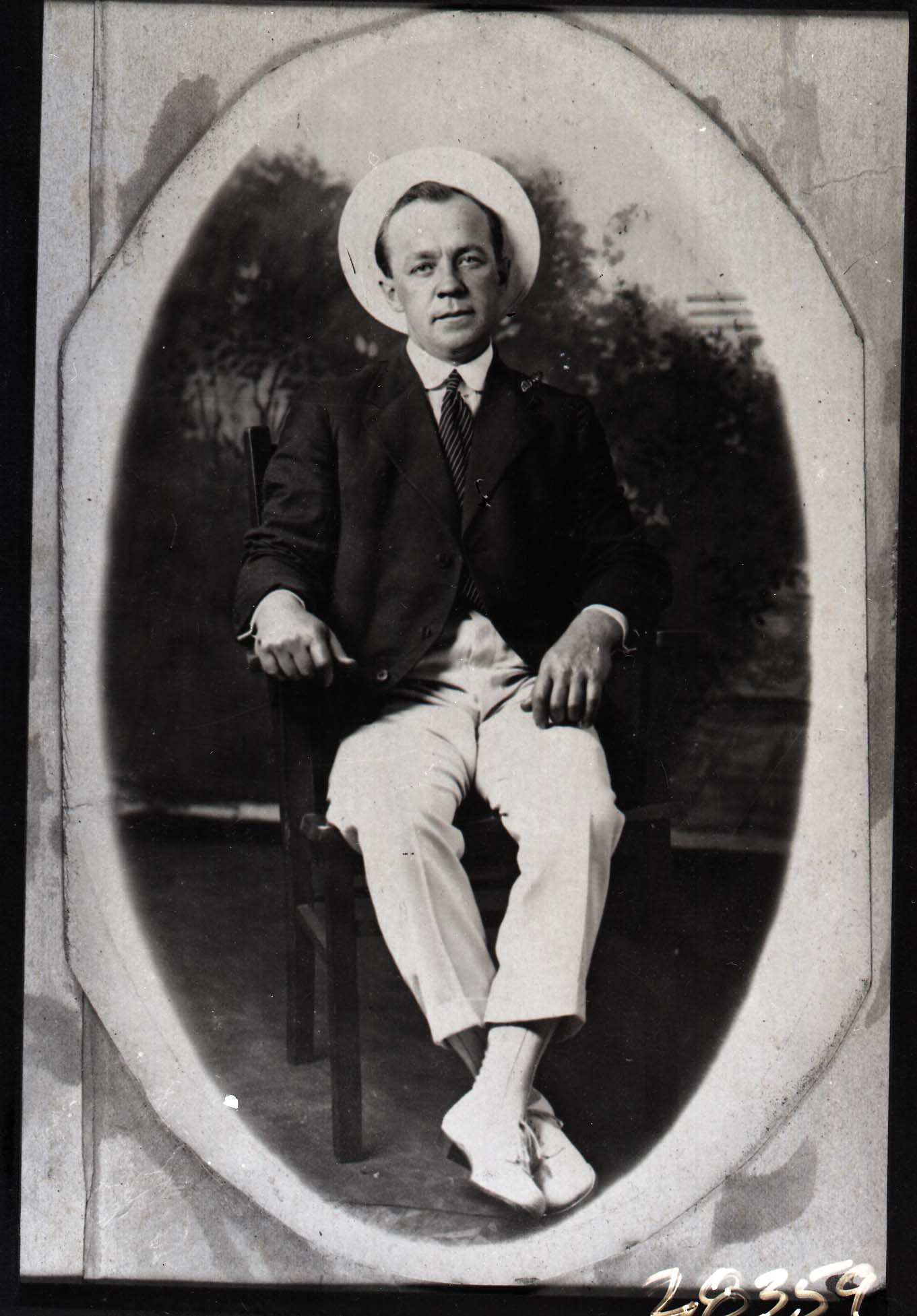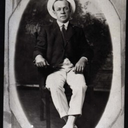 Photo of an oval-shaped photograph of an unidentified man seated in a chair with his ankles crossed and wearing a hat.