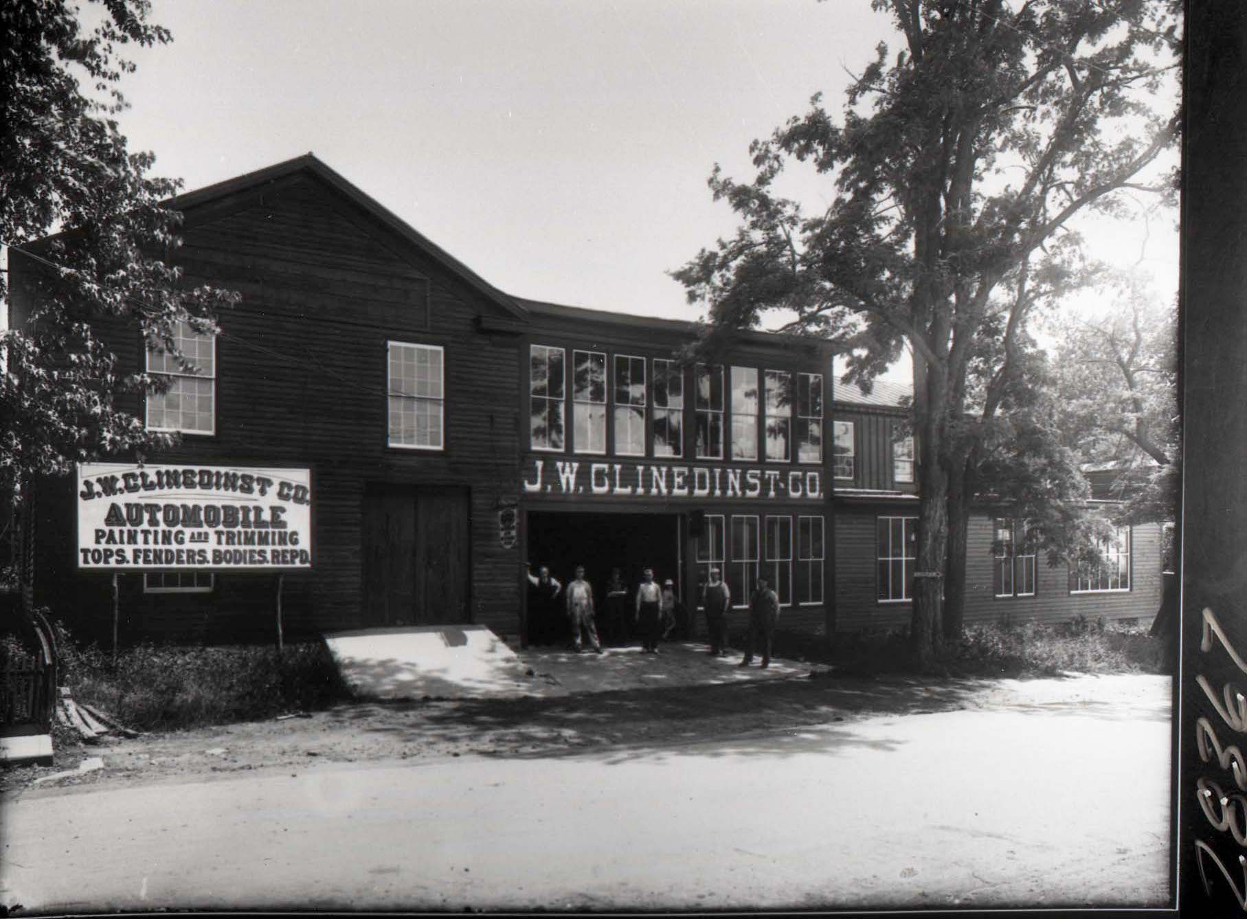 The sign on the left advertises their main services as automobile painting and trimming. In addition, they repaired "tops, fenders, and bodies".