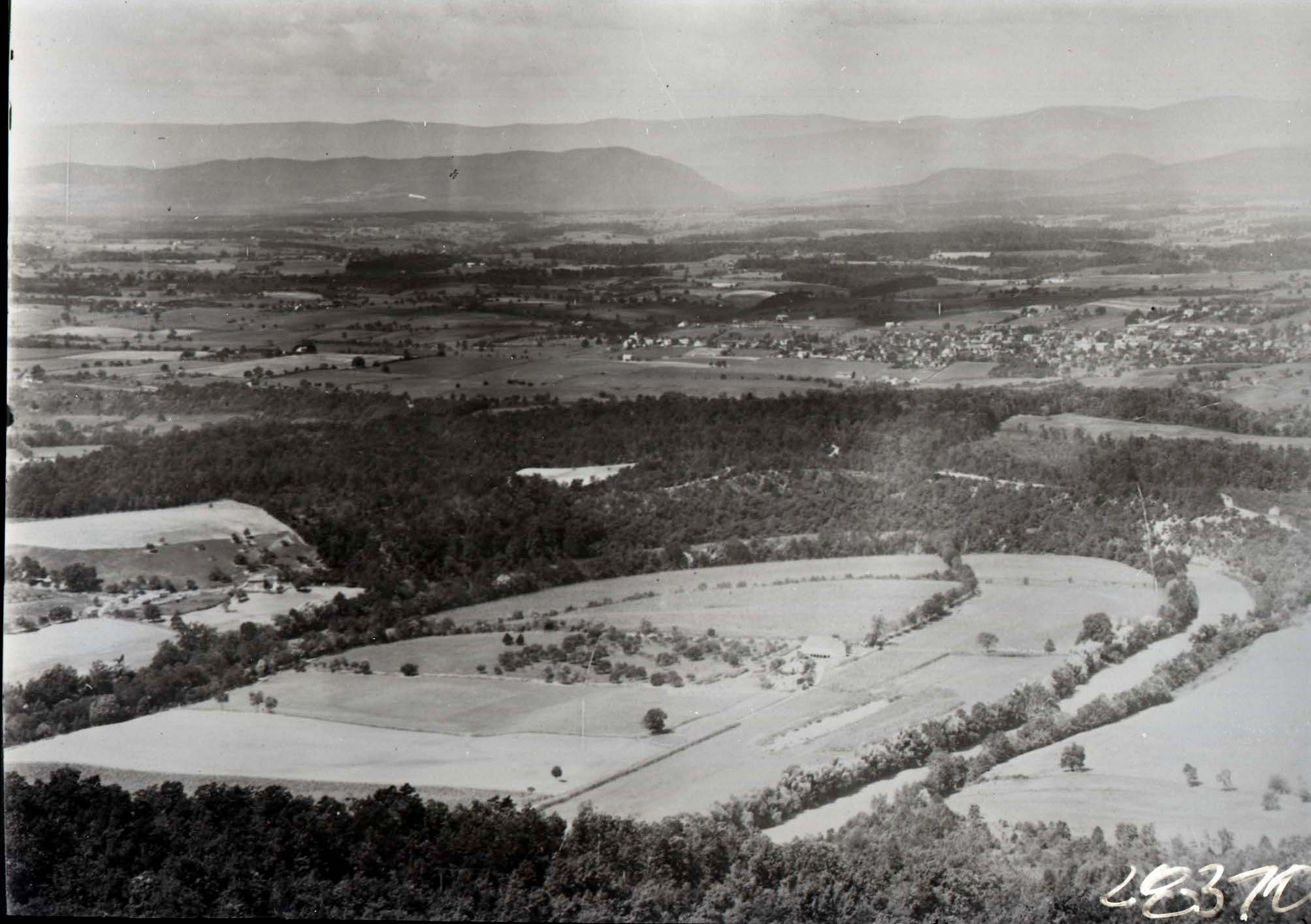 View of the Shenandoah Valley taken from above the area of the Shenandoah River known as Seven Bends and looking west towards the town of Woodstock and the mountains beyond it.
