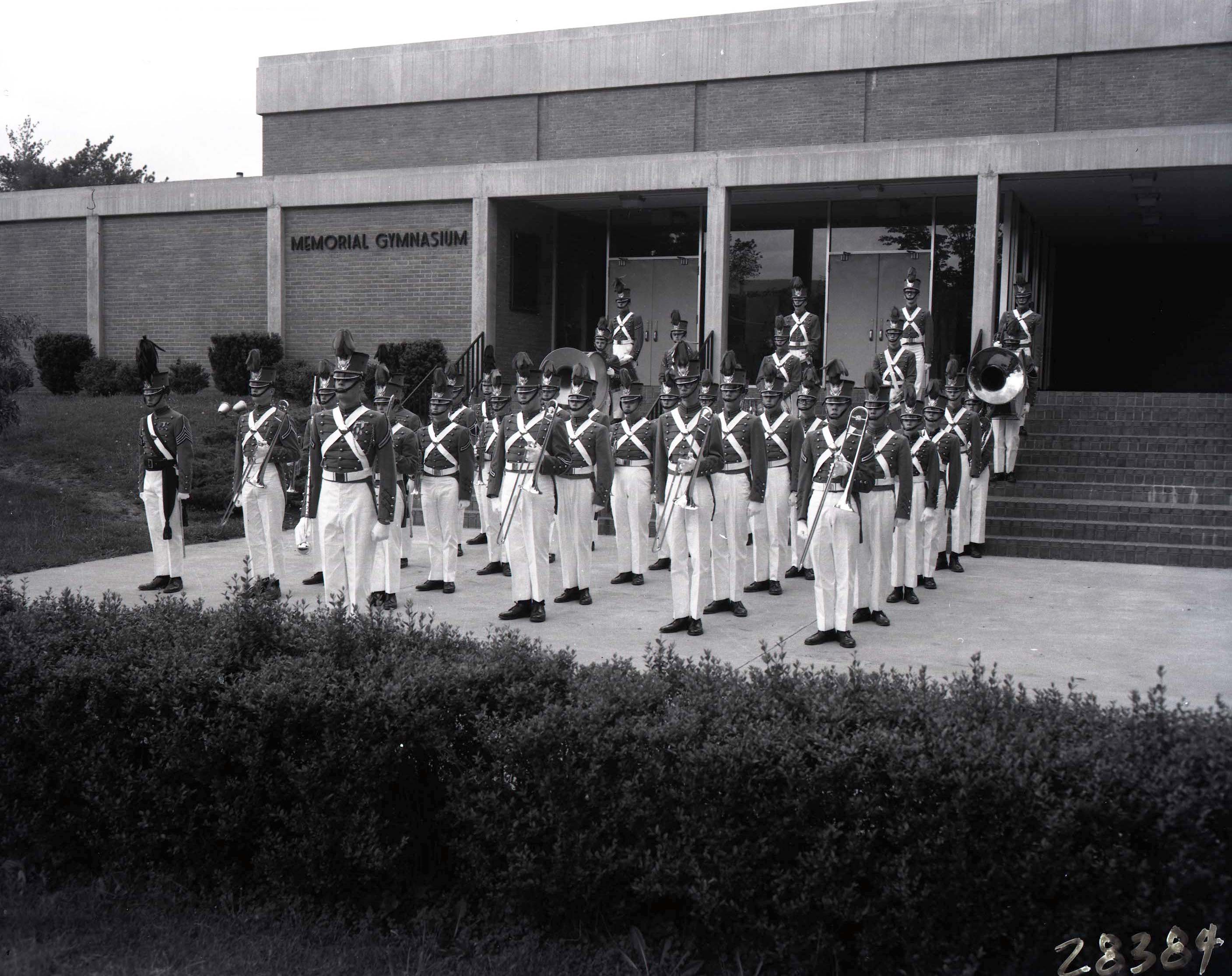 Unidentified cadet members of the Massanutten Military Academy's (MMA) marching band are posed outside Memorial Gymnasium.