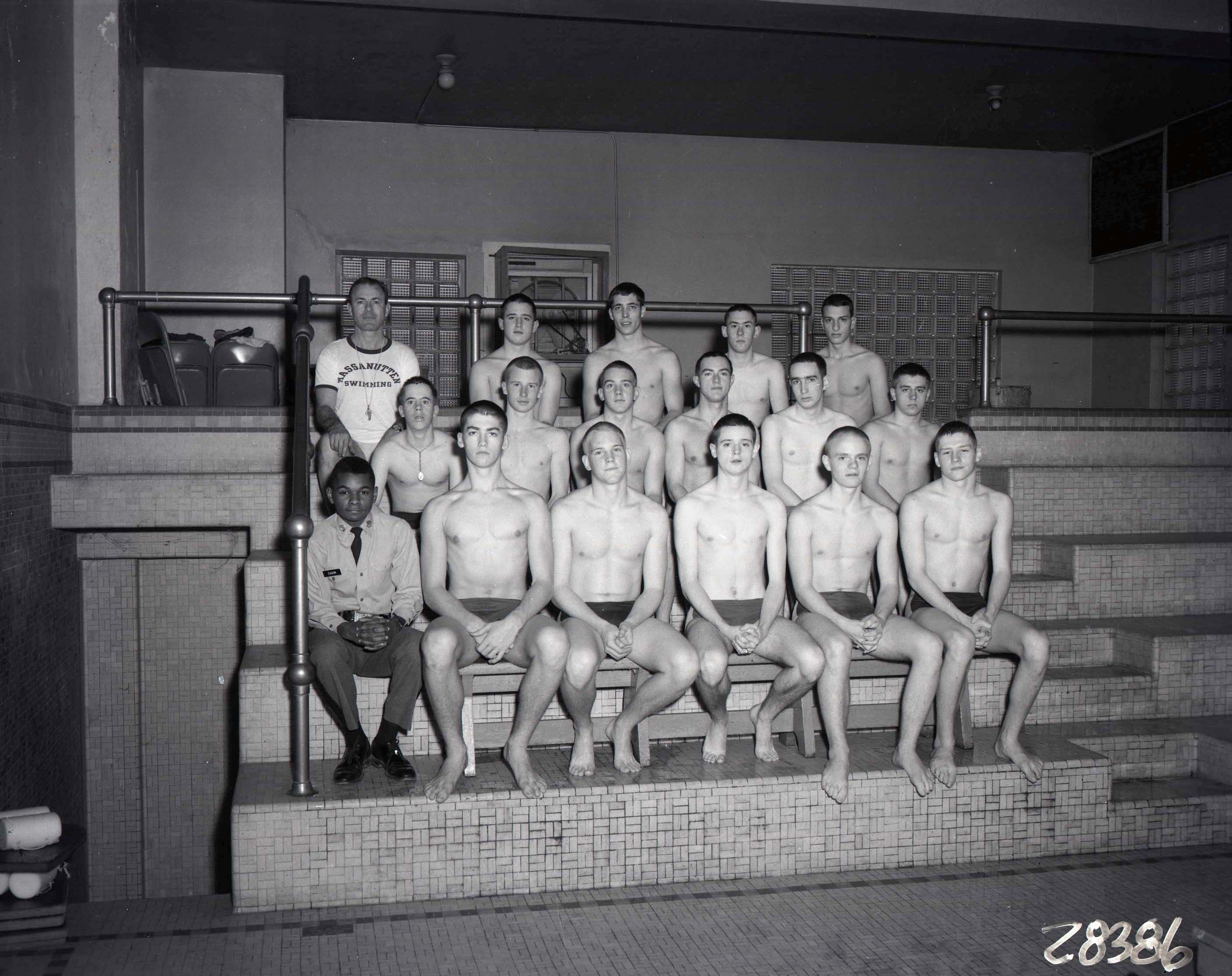 Unidentified members of the Massanutten Military Academy's (MMA) swim team posed with their coach and an African American cadet who may have been the team's manager as he is not wearing swim trunks like the others.