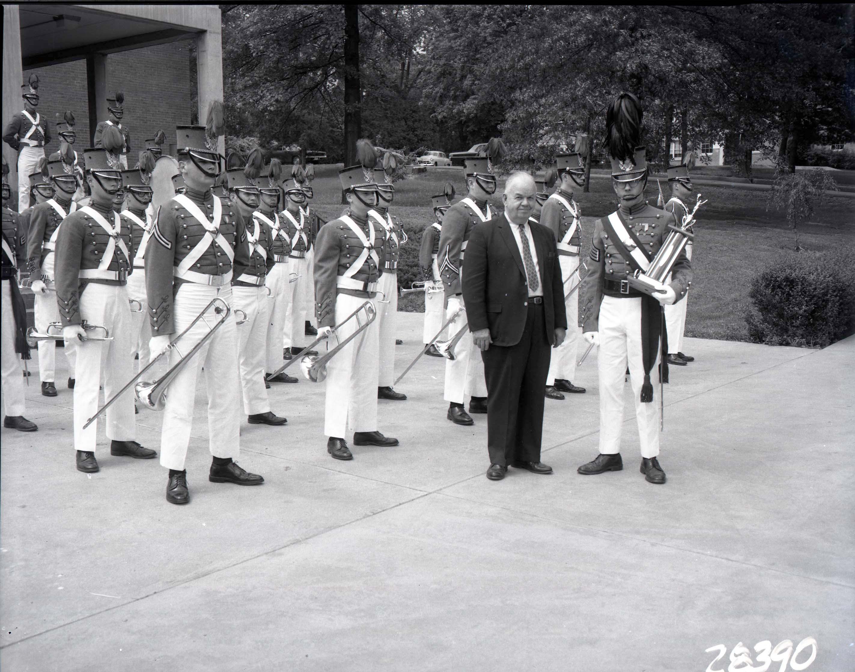 Photograph of Gordon D. Bowman, Sr. standing with the cadets from the Massanutten Military Academy's (MMA) marching band.
