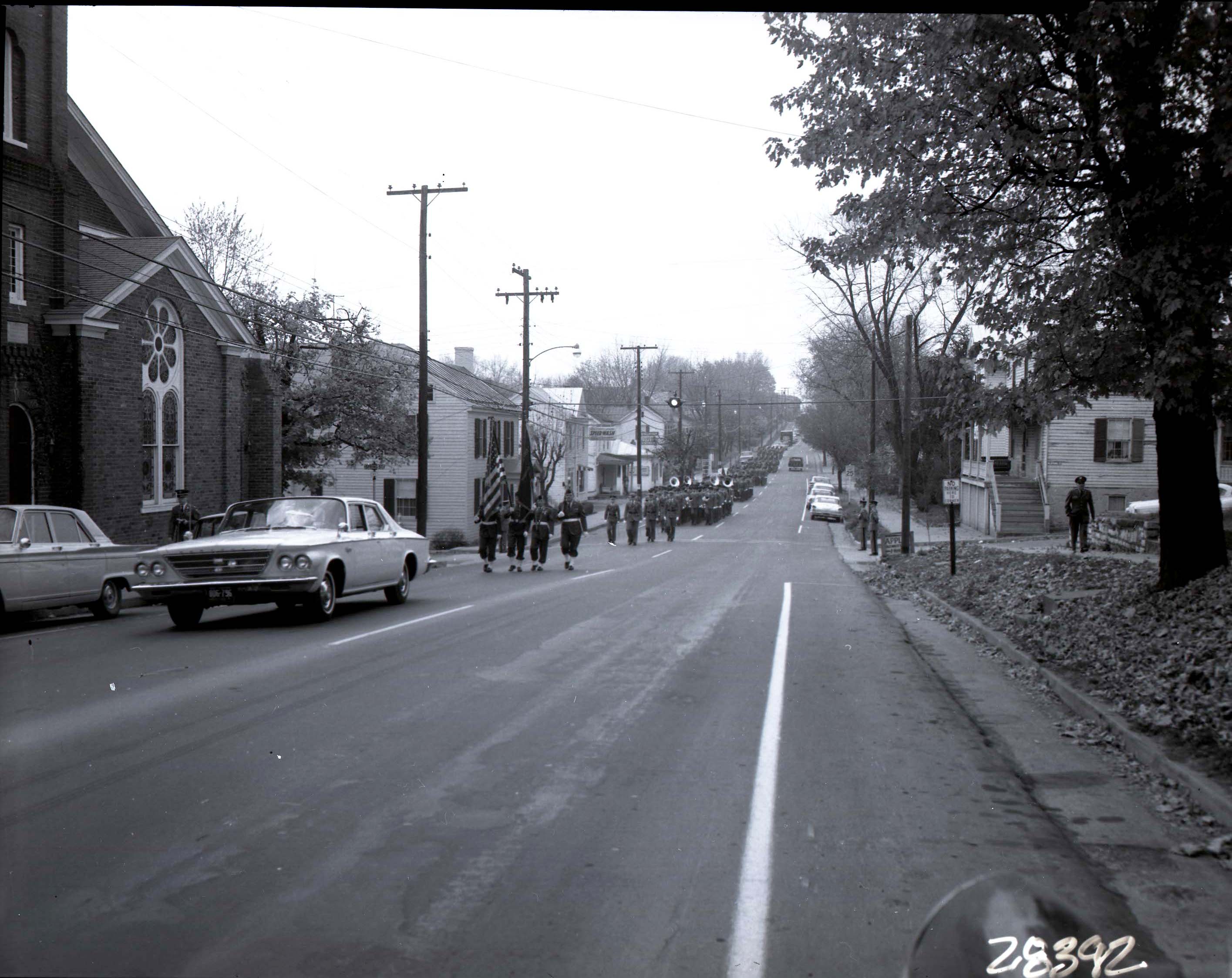 Photograph of a parade marching down Main Street in Woodstock.