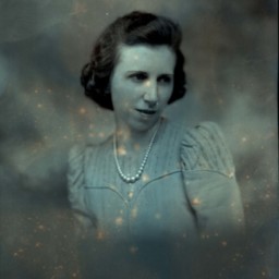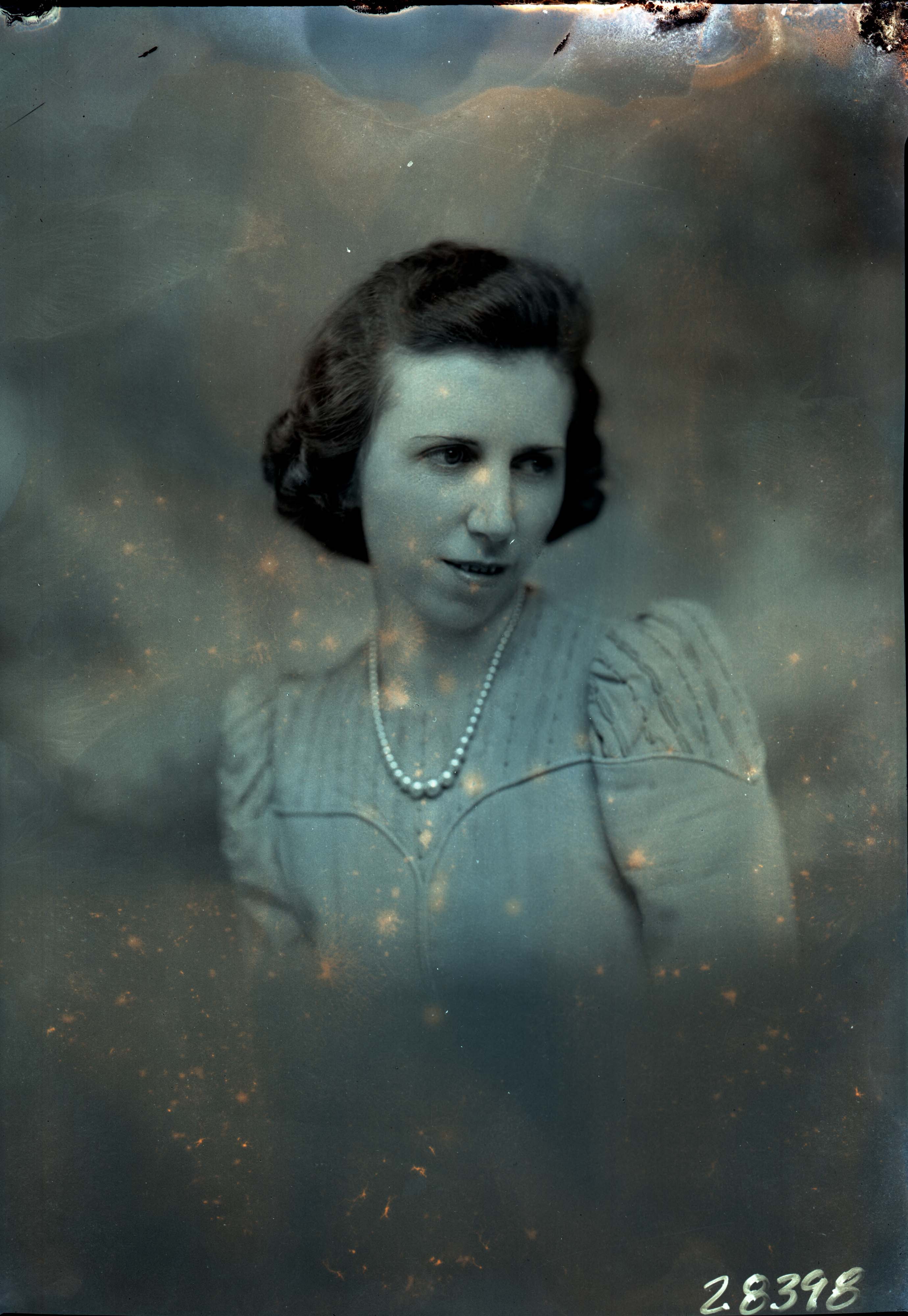 Portrait photograph of an unidentified woman wearing faux pearls and looking downwards and to the side of the camera.