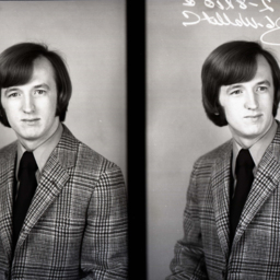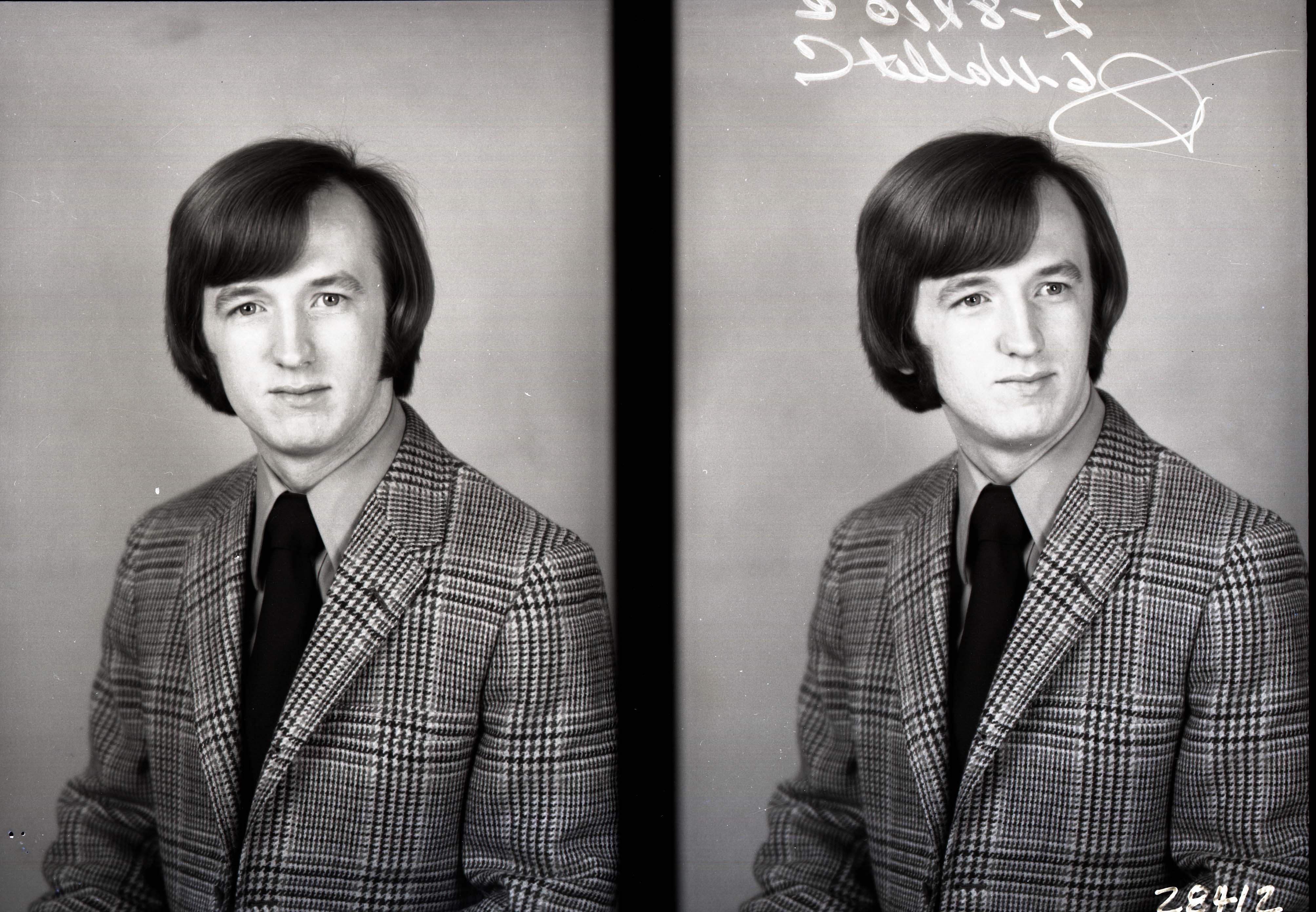 Photo of two separate images of the same unidentified young man wearing a checkered suit jacket and tie.