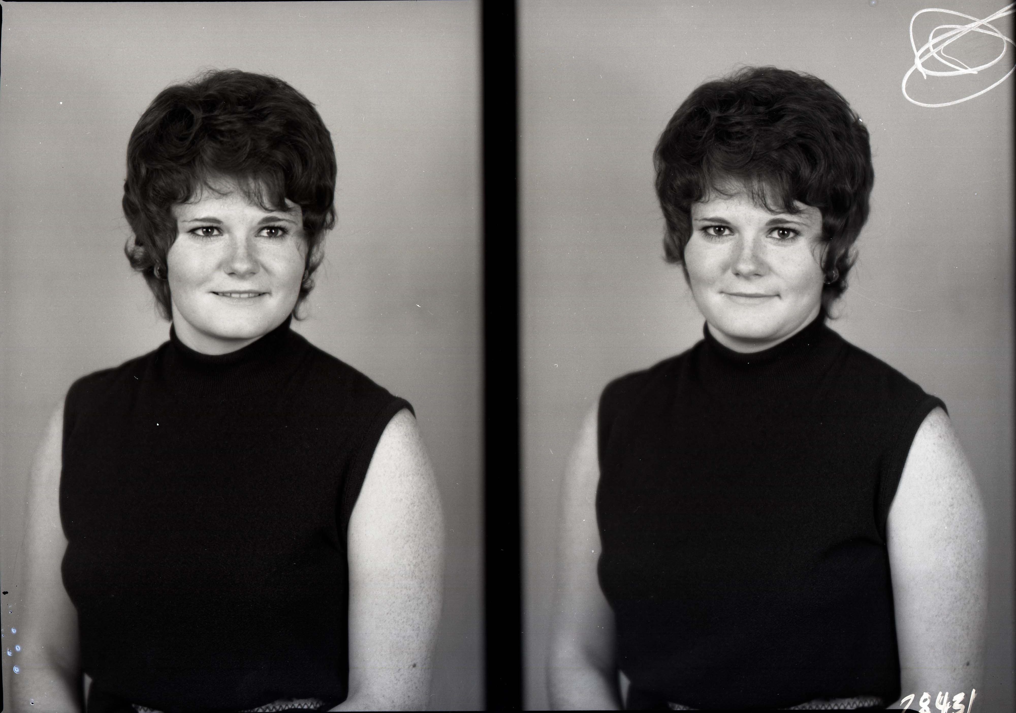 Photo of two portrait photograph of Karen Mora (Bean) Martin as a young woman.