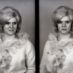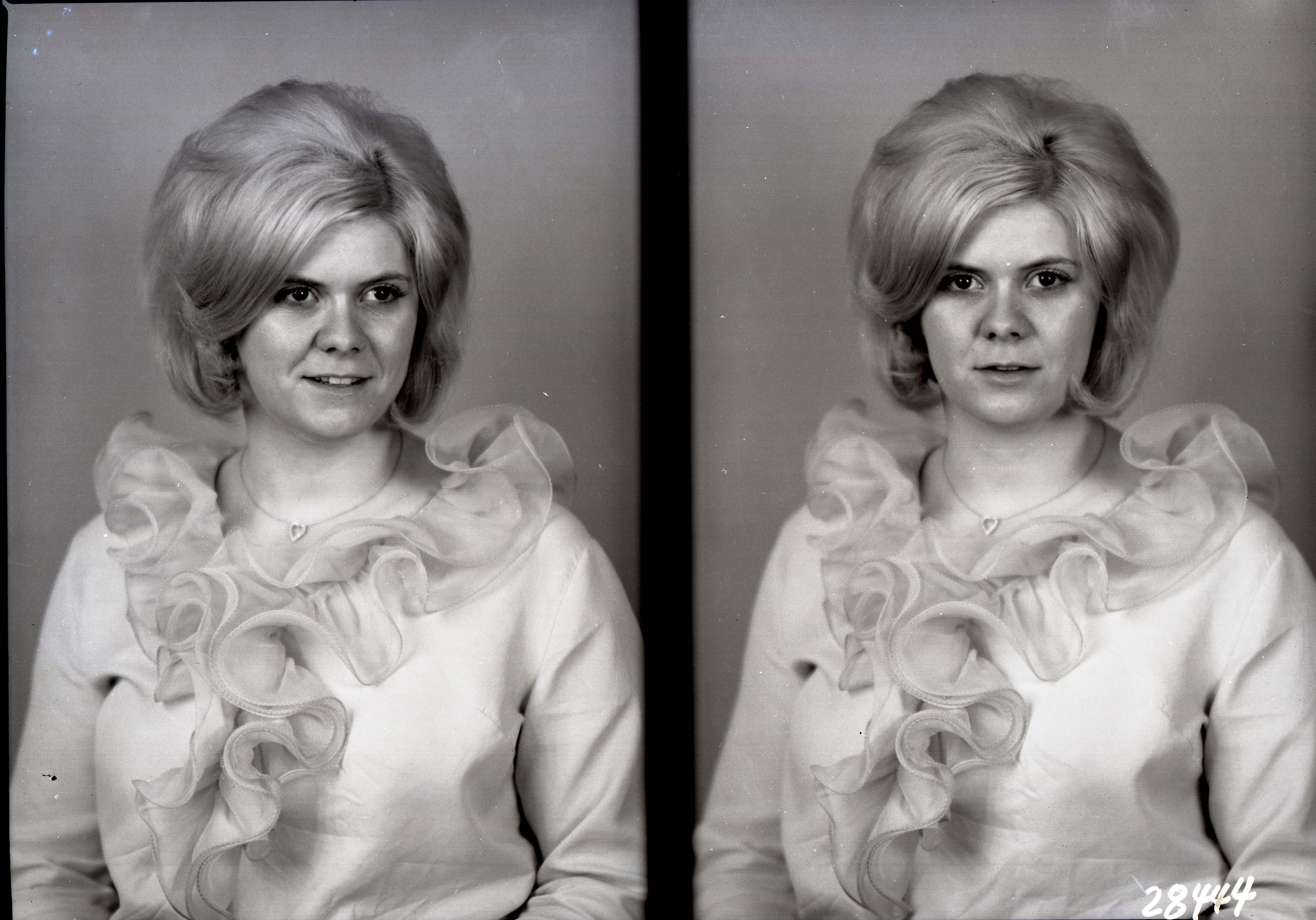 Photo of two separate portrait photographs of the same unidentified woman with short styled hair and ruffles around the neckline of her blouse.
