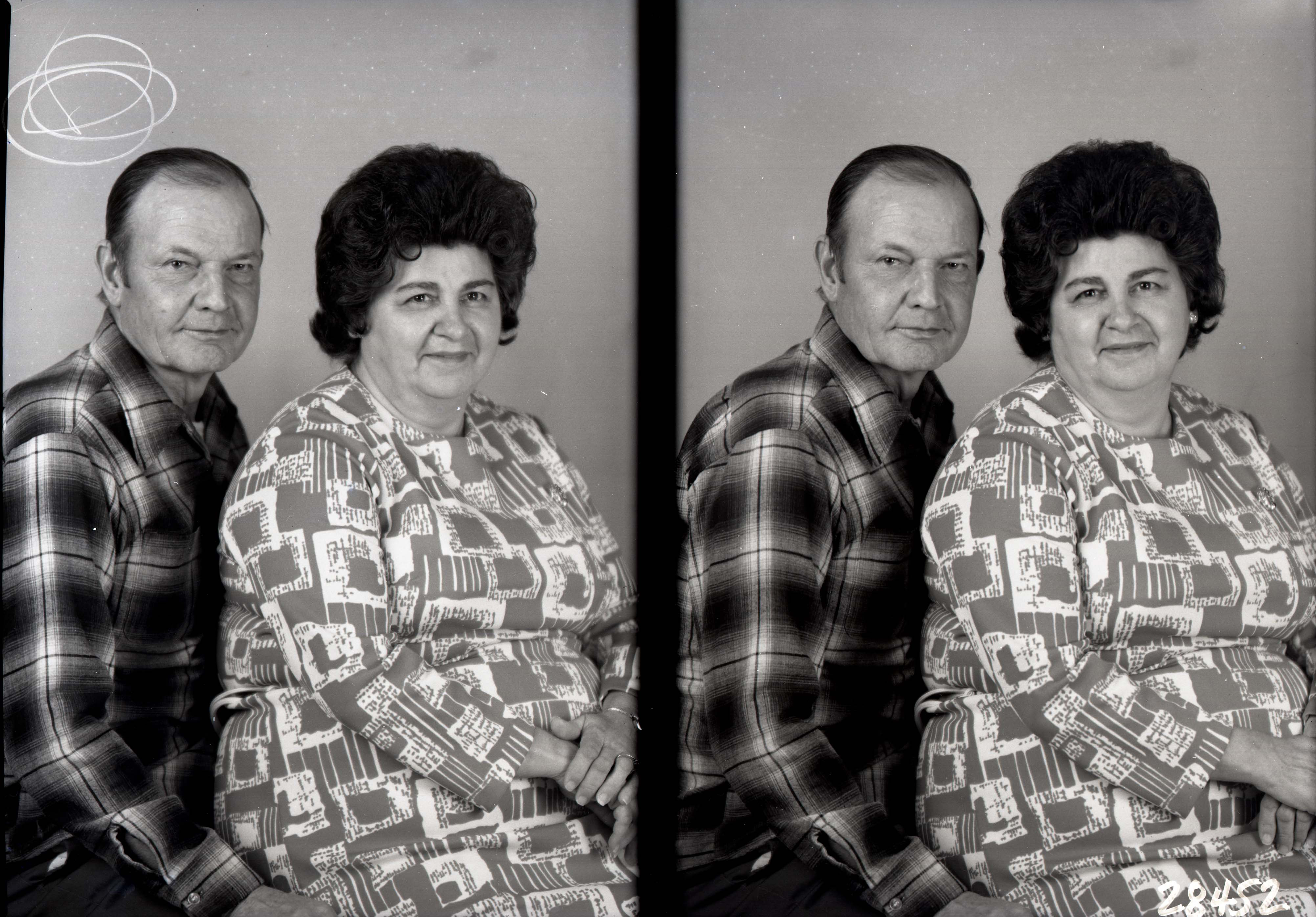 Photo of two separate portrait photographs of Charlie Rush posed with his wife.
