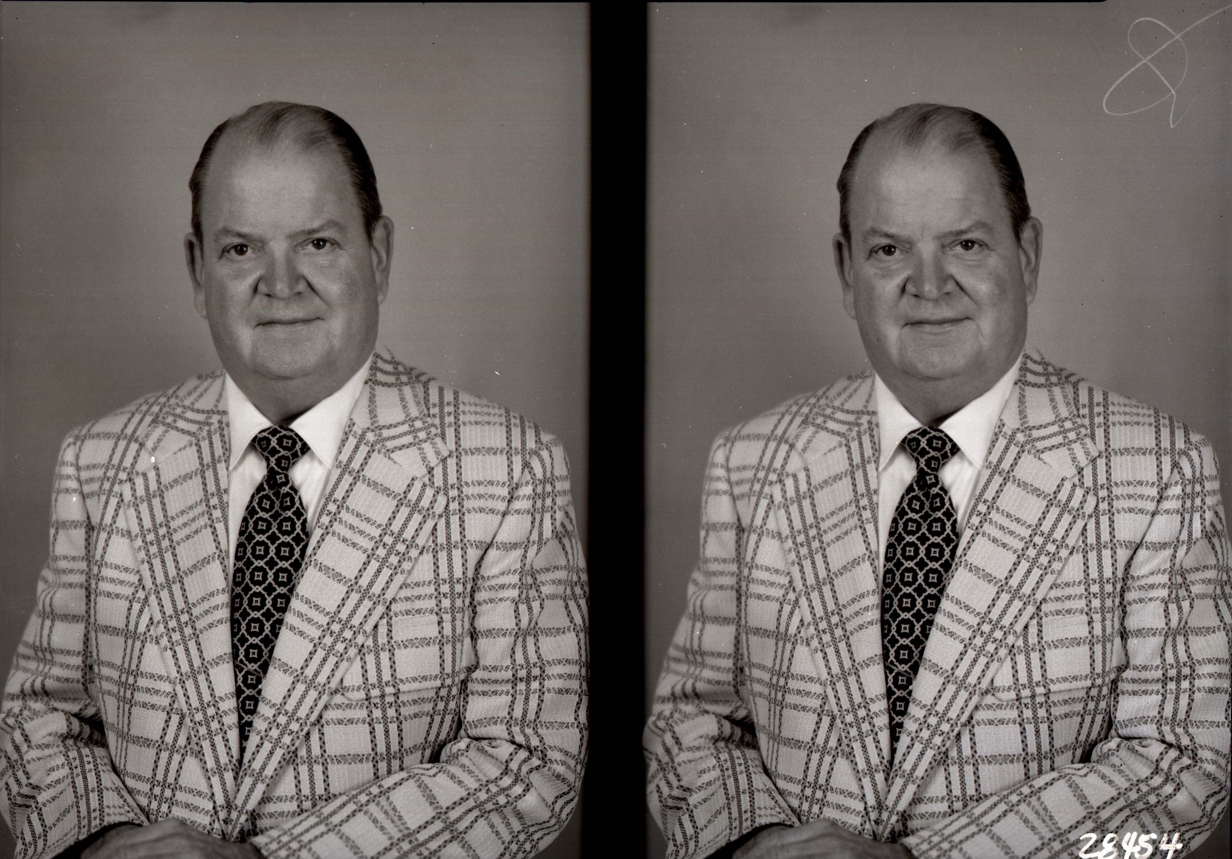 Photo of two separate portrait photographs of the same unidentified man in a plaid jacket and print tie.