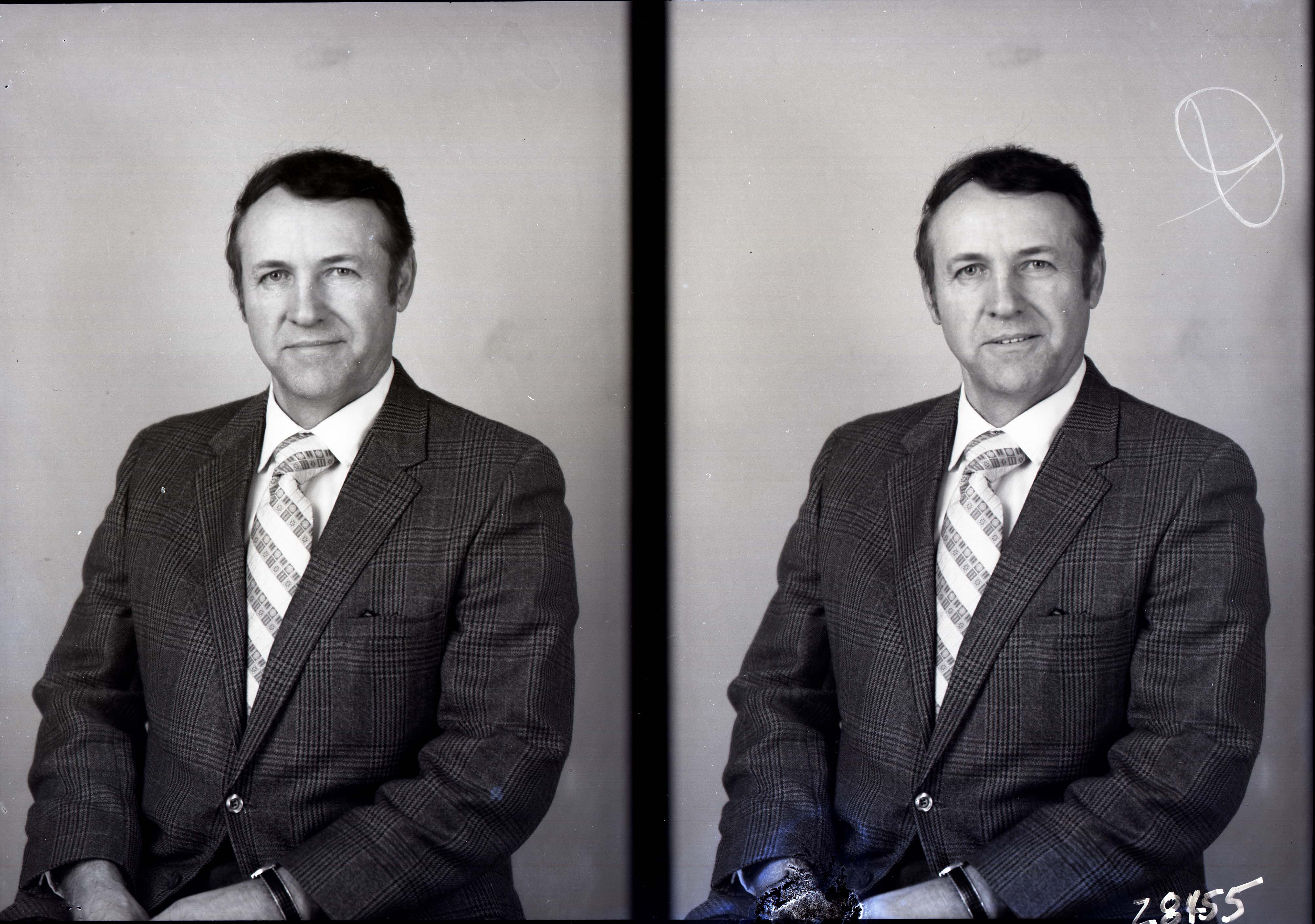 Photo of two separate portrait photographs of Homer Allen Long, Jr. wearing a suit and striped tie.