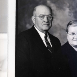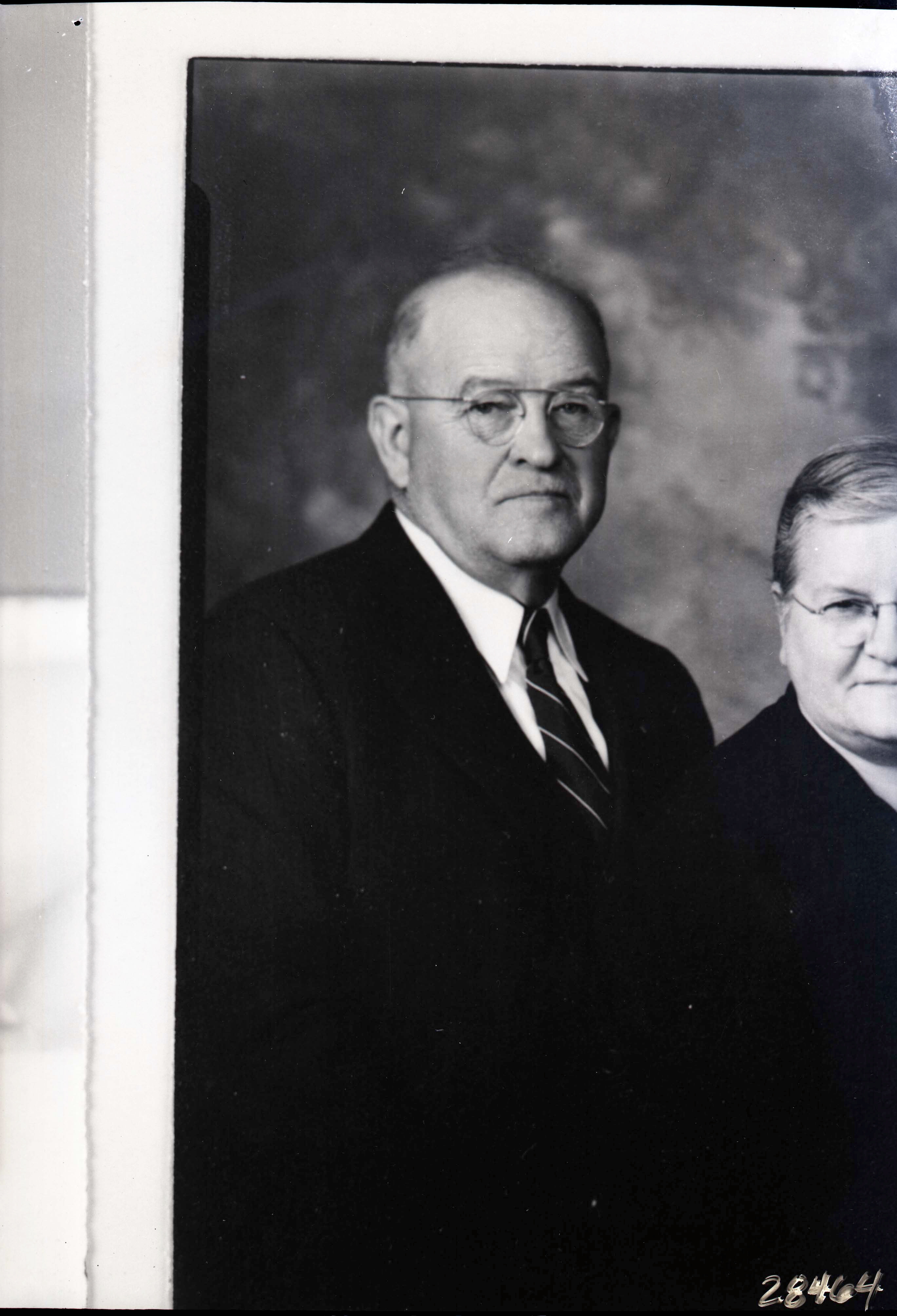 Photo of a photograph of an unidentified man with glasses in a suit and tie posed with an unidentified woman who has been partially cropped out of the frame.