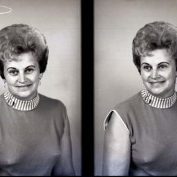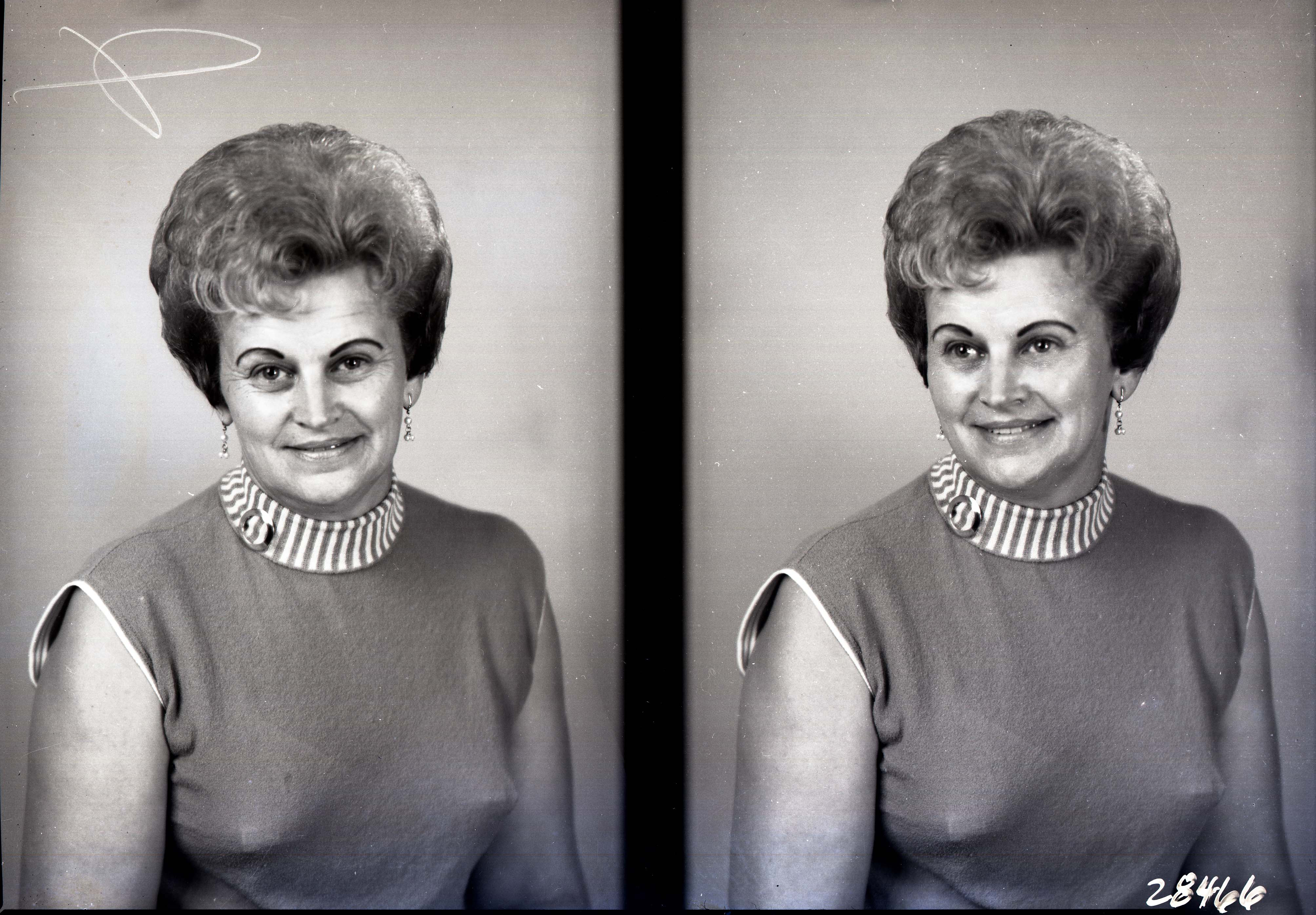 Photo of two separate portrait photographs of the same unidentified woman with short, styled hair and a striped collar on her sleeveless dress.