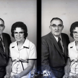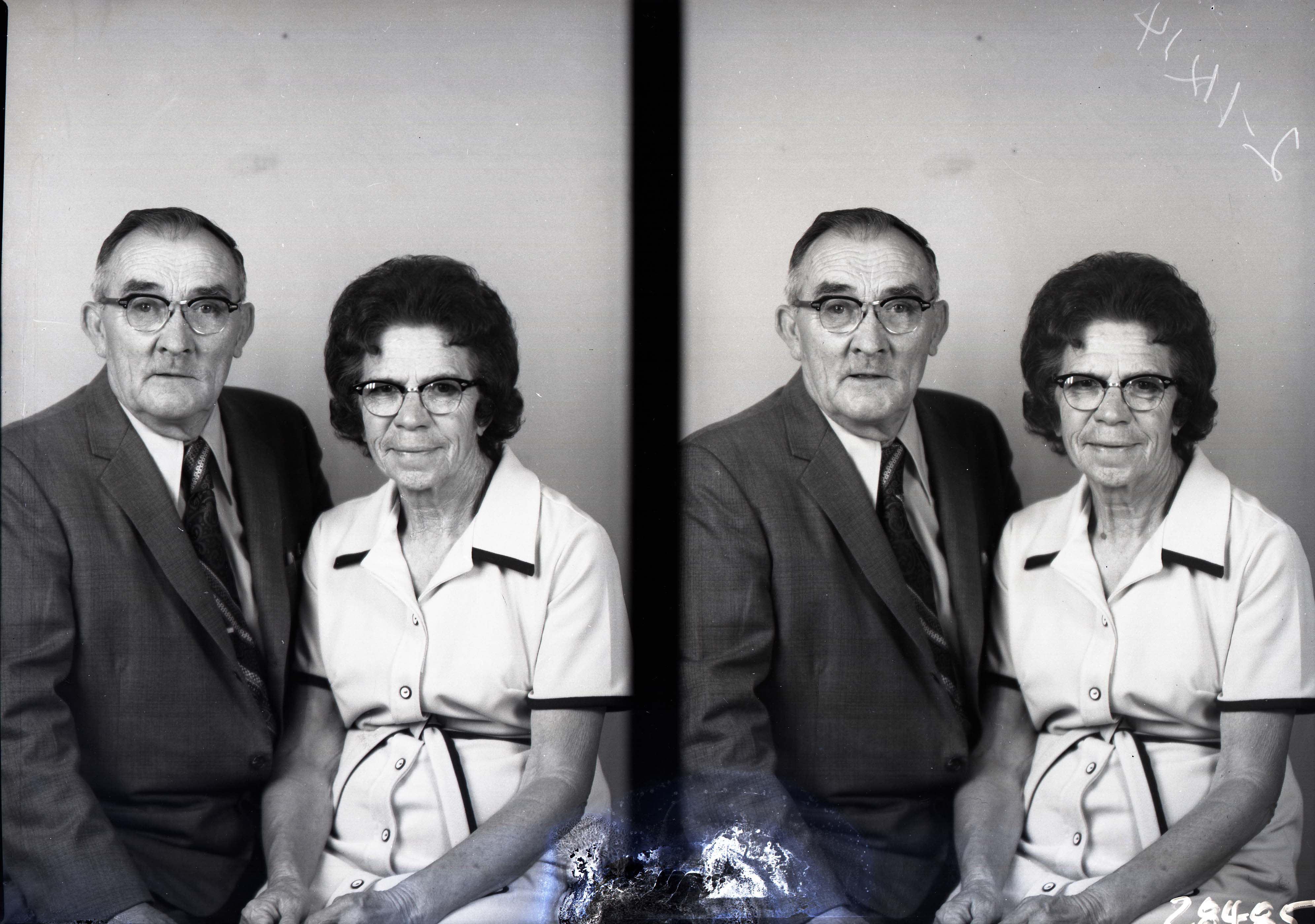 Photo of two separate portrait photographs of an unidentified older man and unidentified woman posed together. Both are wearing glasses.