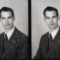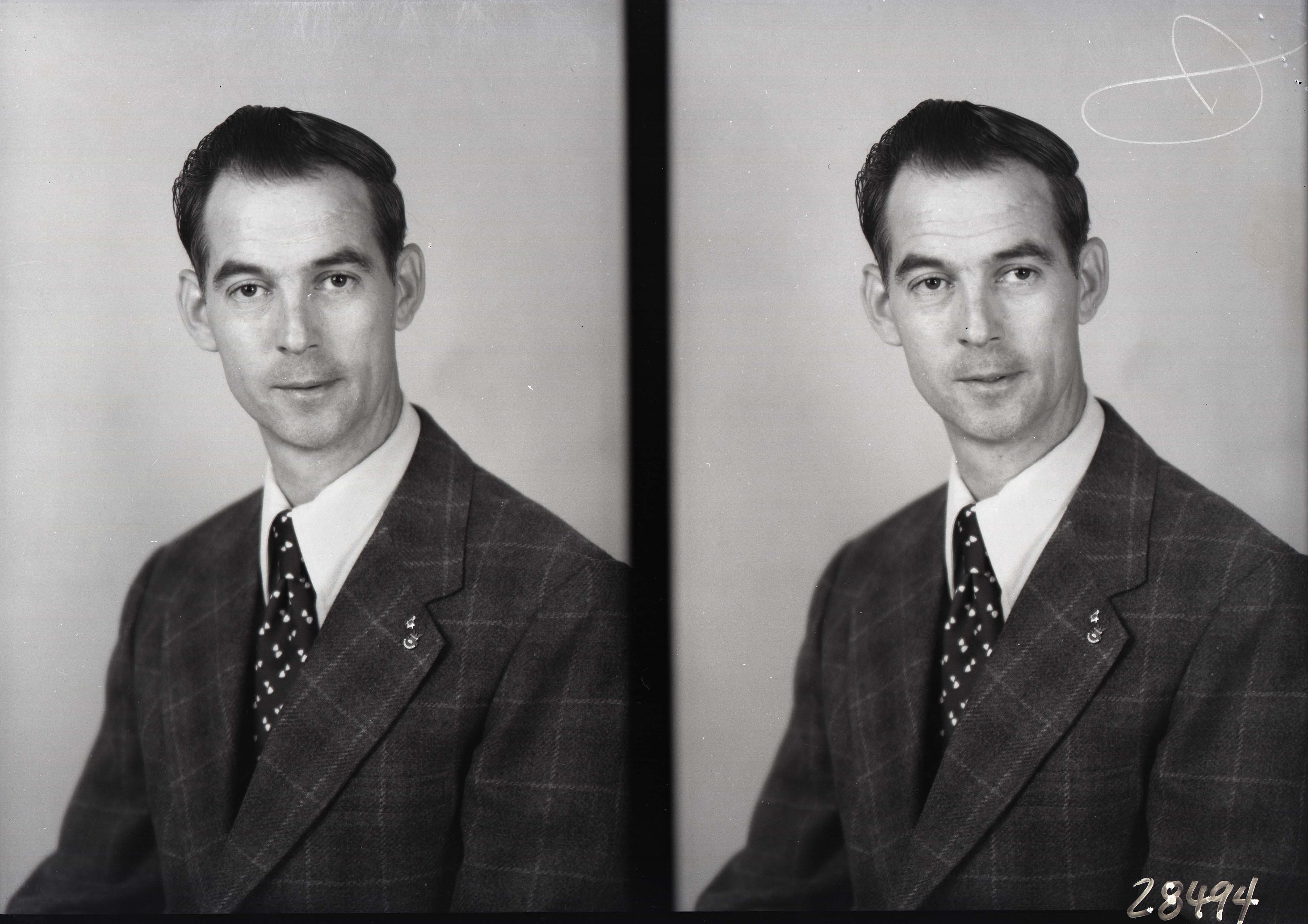 Photo of two separate portrait photographs of the same unidentified man in a suit and tie with pins on his lapel.