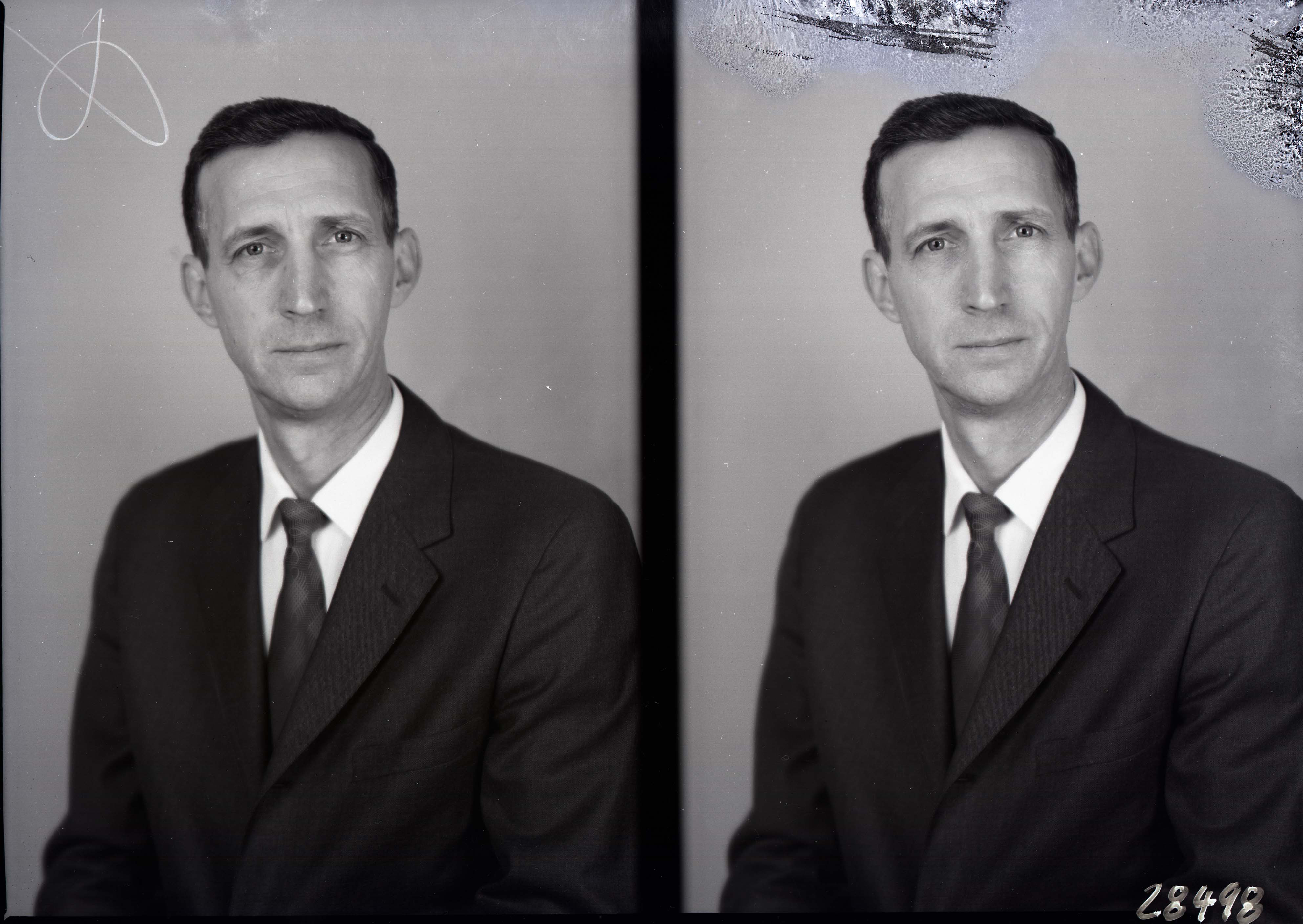 Photo of two separate portrait photographs of Robert "Bob" Artz in a suit and tie.