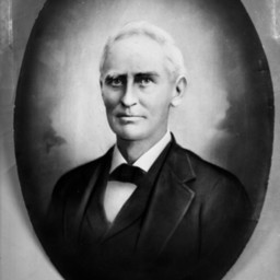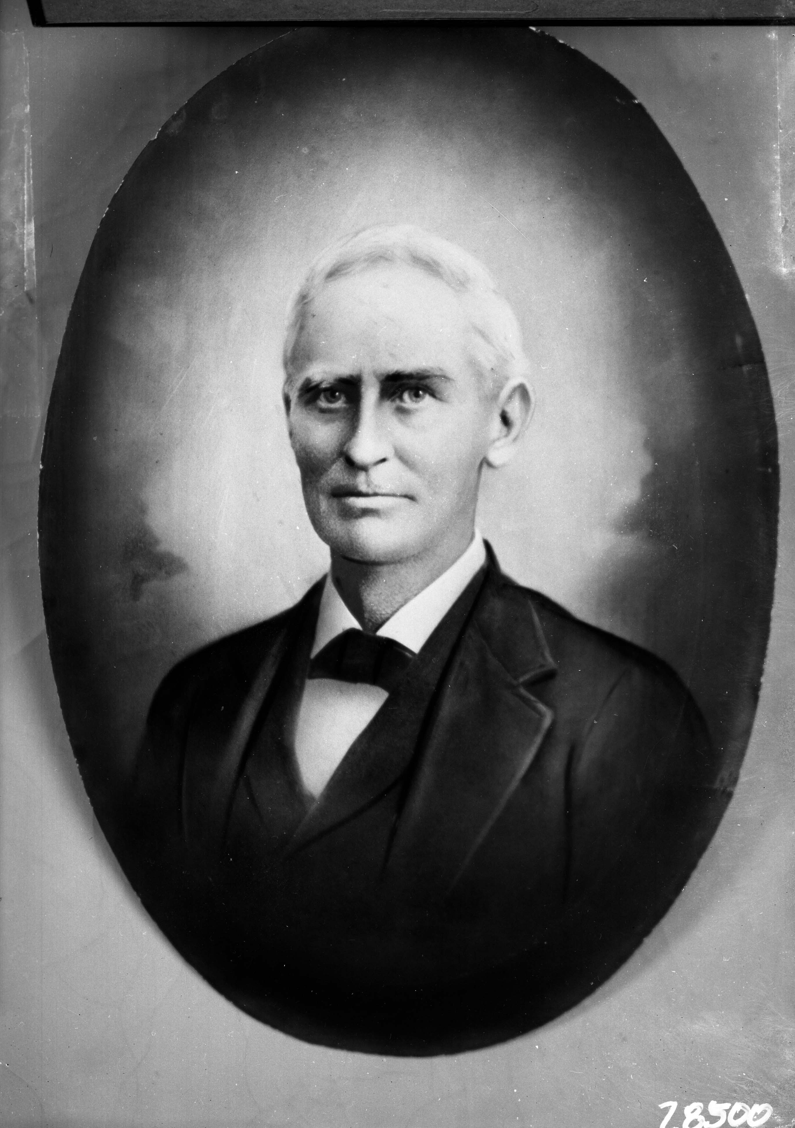 Photo of an oval-framed photograph of an unidentified man with bushy eyebrows wearing a suit from the late 19th century or early 20th.